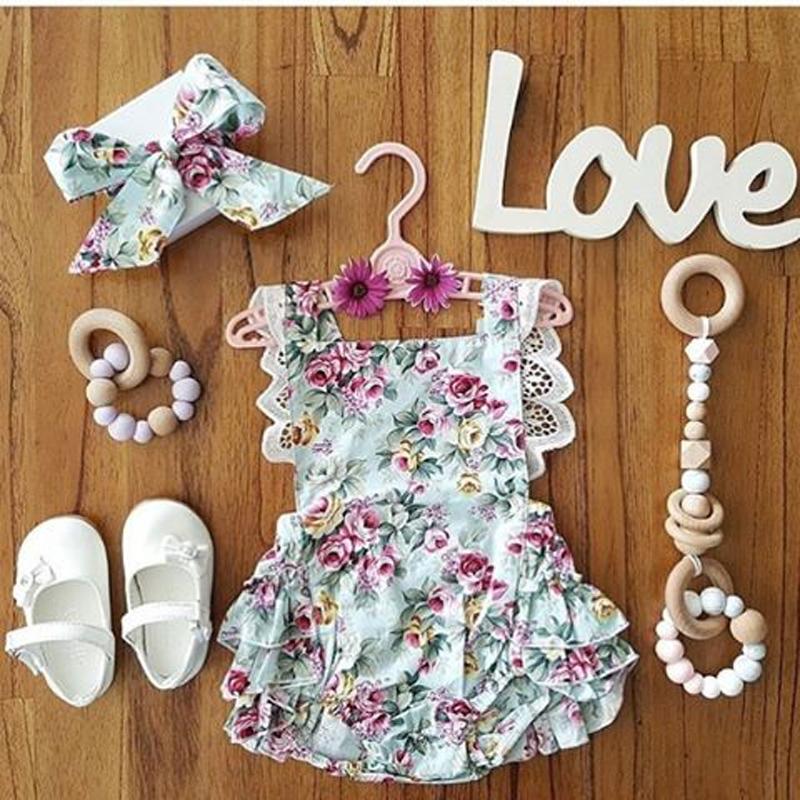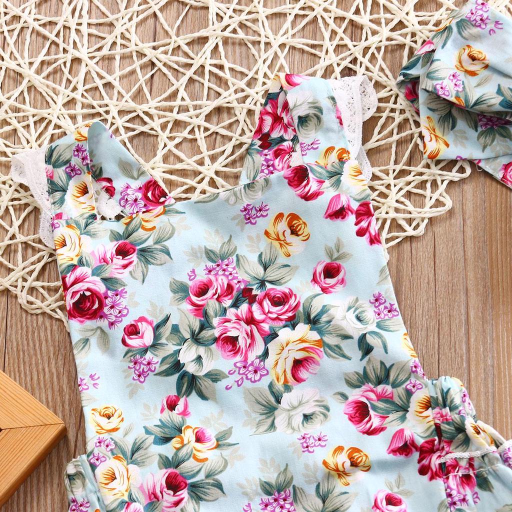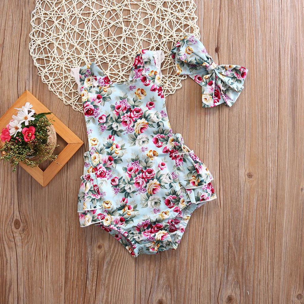 Комбинезон для новорожденных девочек, одежда с цветочным принтом, комплект, кружевной комбинезон без рукавов, комбинезон + повязка на голову, игровой костюм, От 0 до 24 месяцев