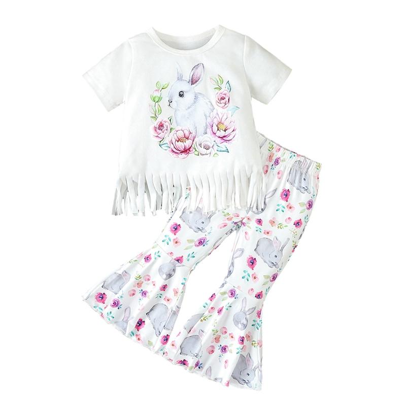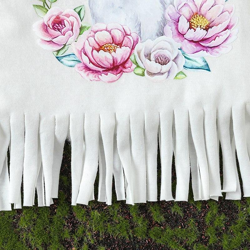 дизайн: Круглый вырез, подол с бахромой, принт кролика, рубашка с короткими рукавами, милый кролик и брюки с цветочным принтом — этот наряд сделает вашу маленькую принцессу еще красивее.