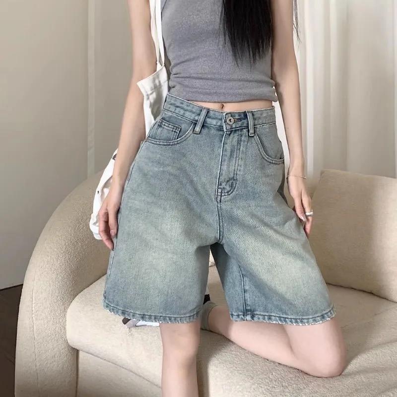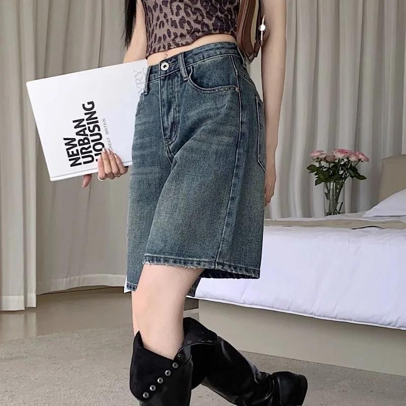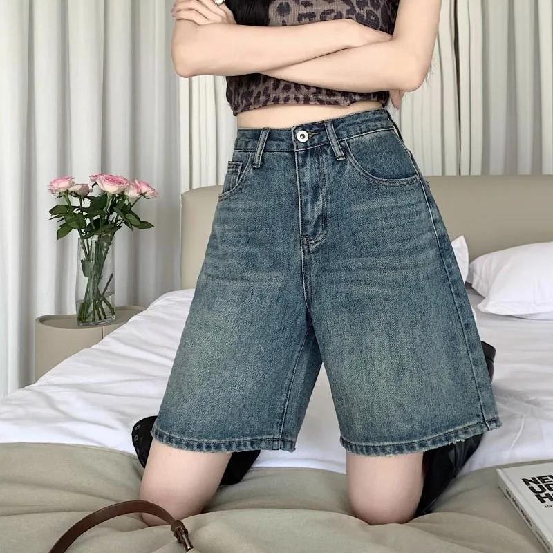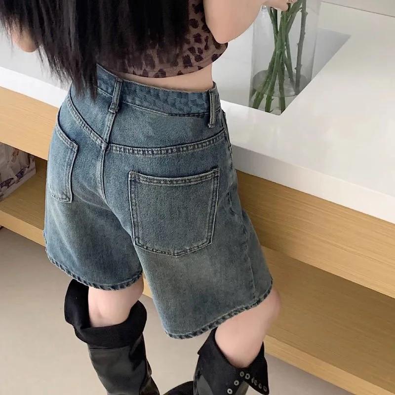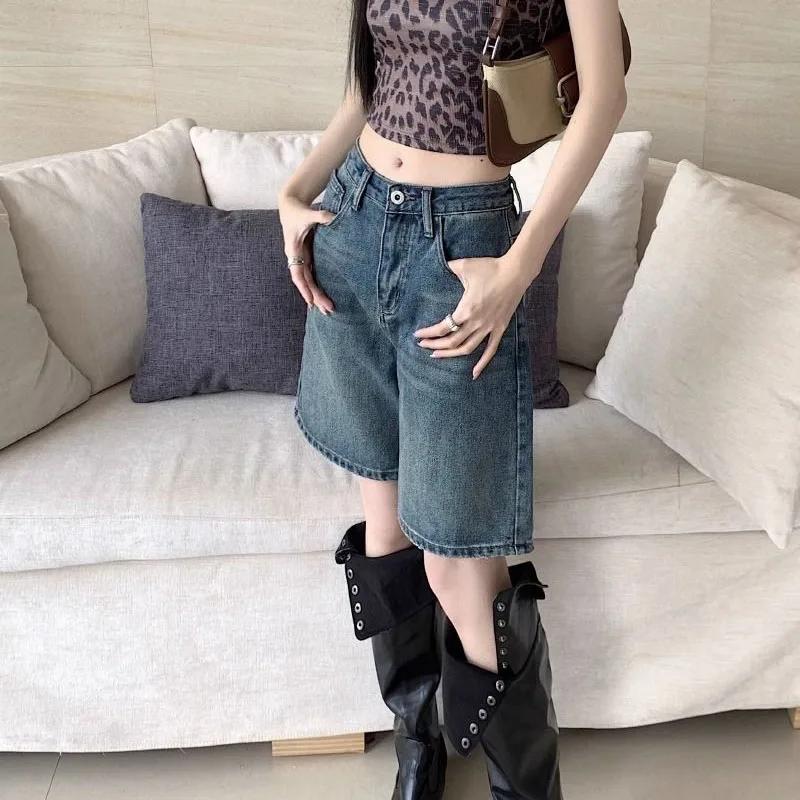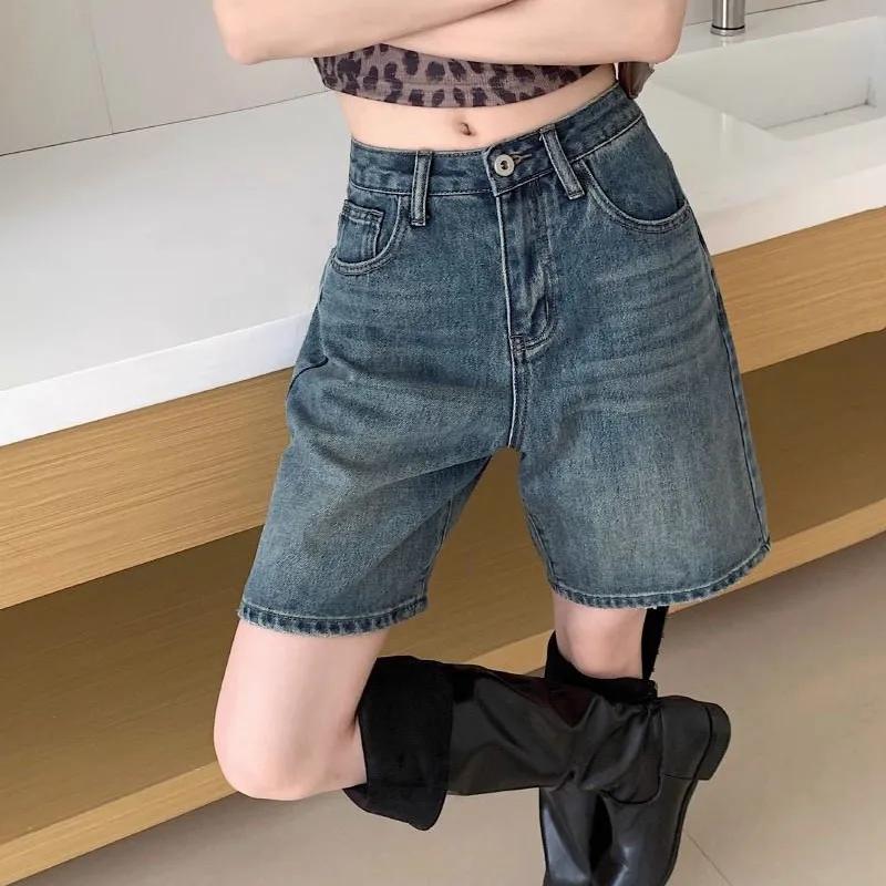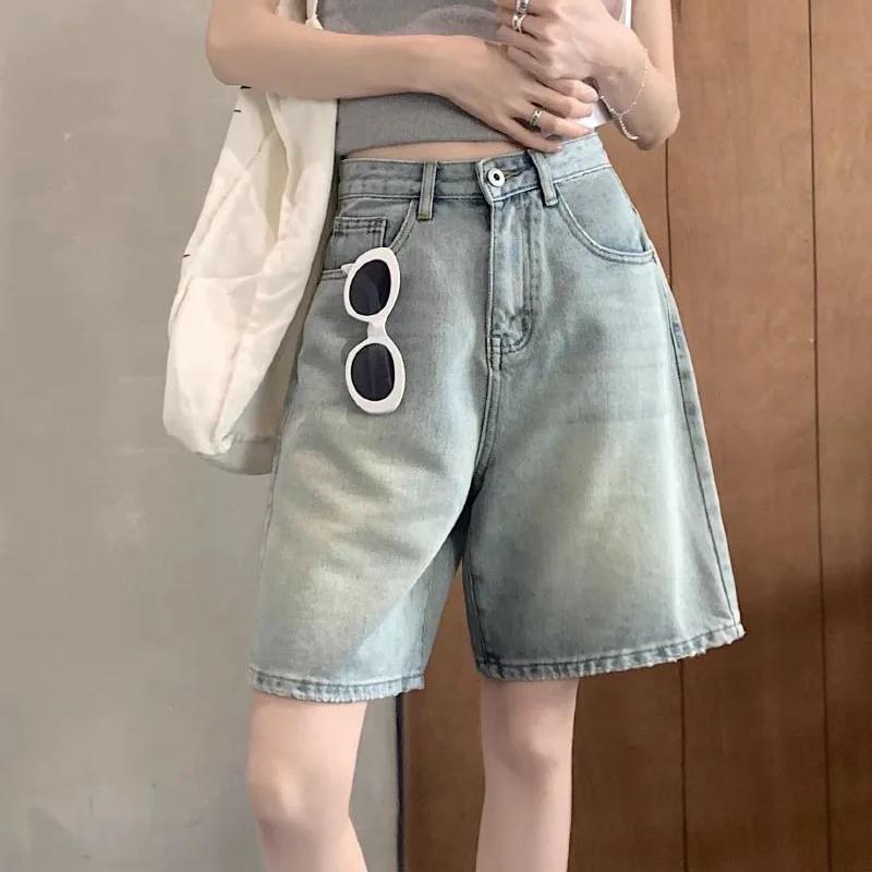 2024 винтажные синие джинсовые шорты, женская модная уличная одежда, прямые джинсы до колена, женские летние мешковатые джинсовые шорты с высокой талией
