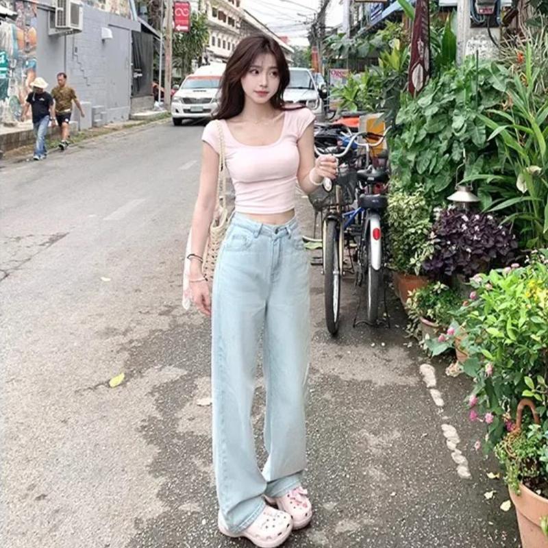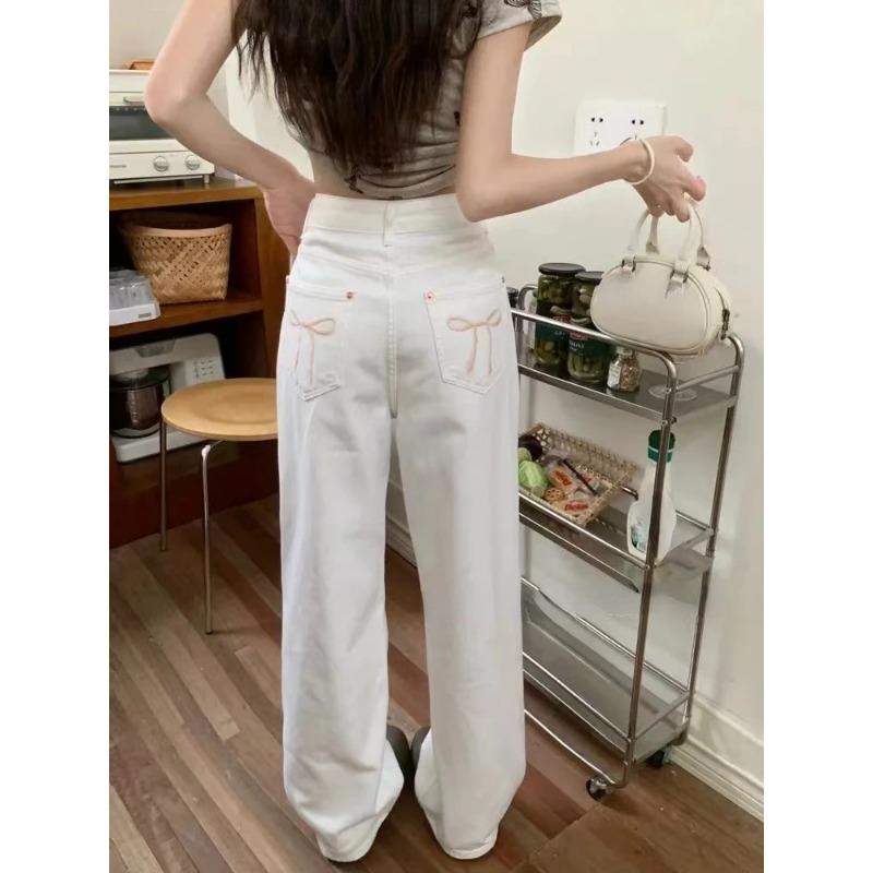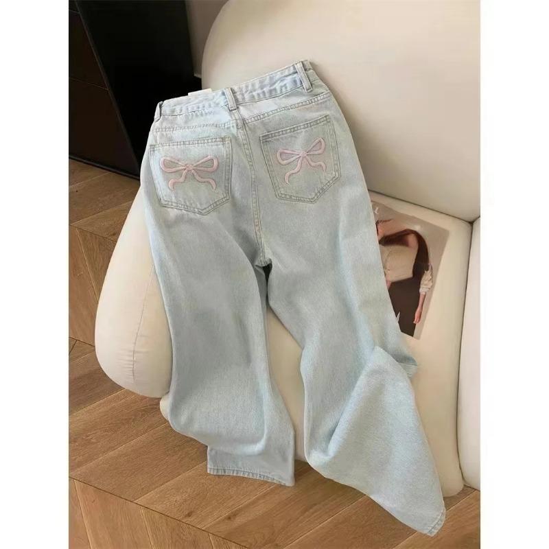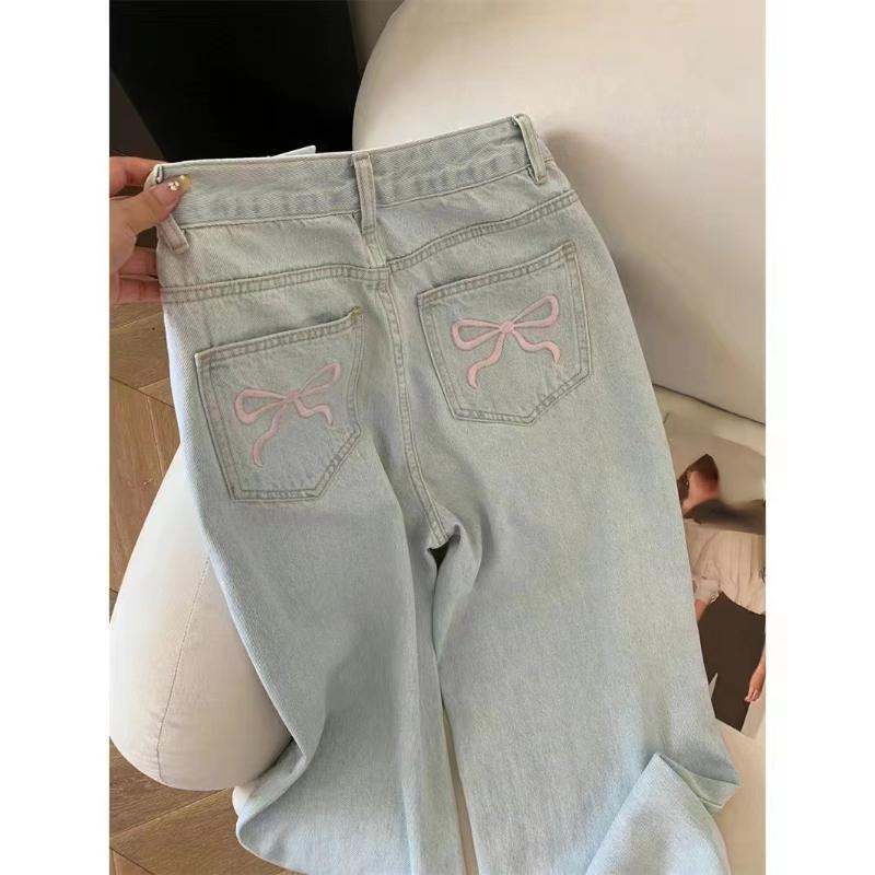 2024 синие джинсы для женщин, высококачественные американские широкие брюки с высокой талией и вышивкой бантом Y2K, винтажные прямые летние брюки