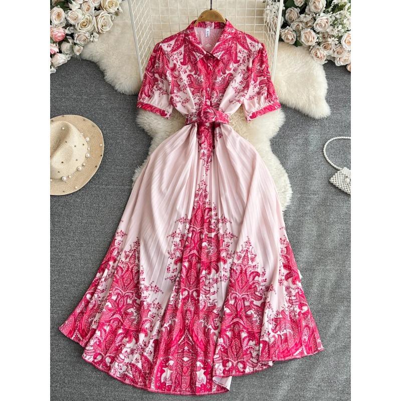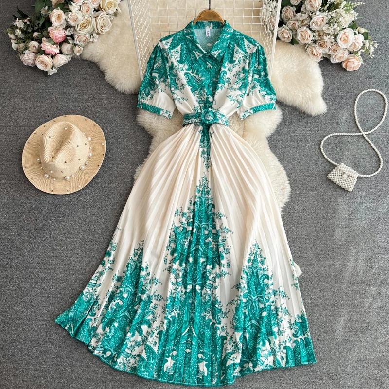 Летнее винтажное женское плиссированное вечернее длинное платье с принтом, элегантный отложной воротник, короткий рукав, высокая талия, драпировка, пляжные платья, новое