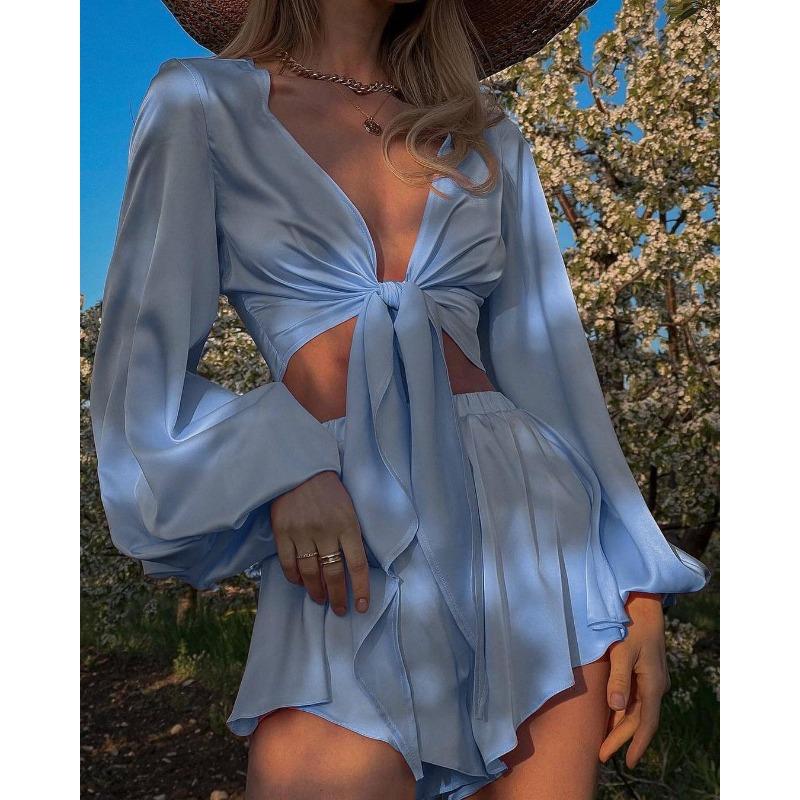 Новый женский комплект из французского топа и шорт на шнуровке с длинными рукавами — купить товар онлайн с бесплатной доставкой по всему миру!