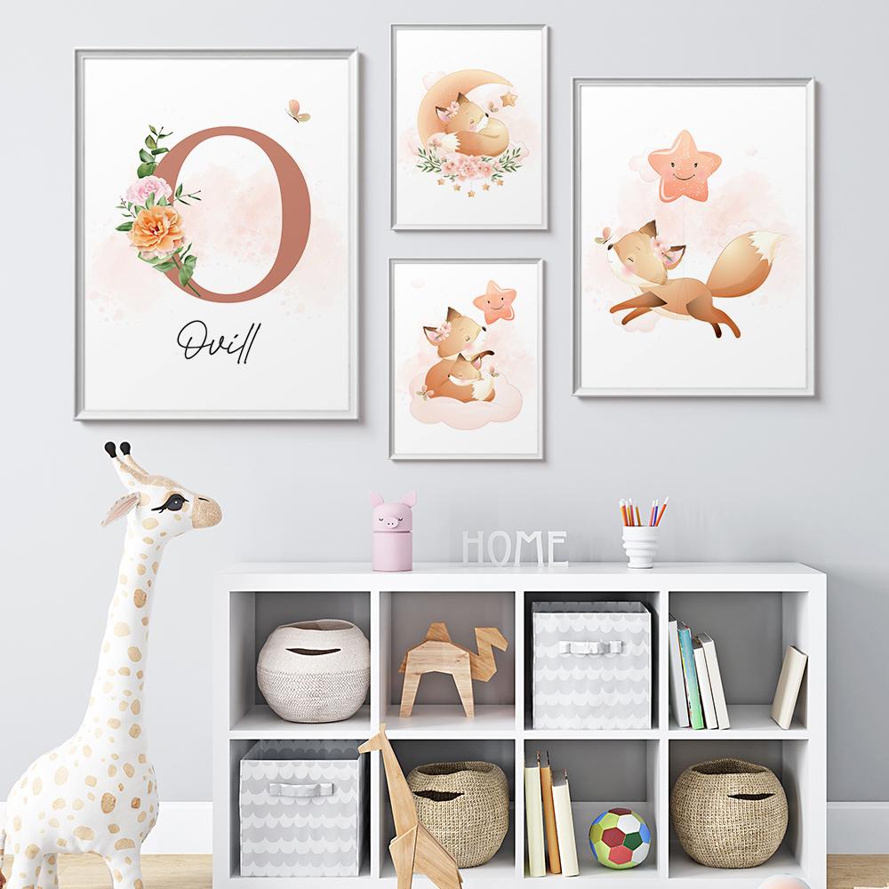 Nordic Custom Name Персонализированное Животное Лиса Настенная Живопись Холст Картина Плакаты Картина Для Детей Детская Комната Девочки Домашний Декор