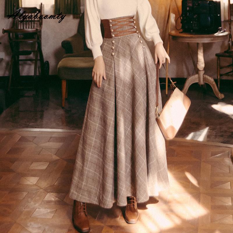 Осень-зима в английском стиле, женская длинная теплая юбка макси с высокой талией, бандажная плотная клетчатая шерстяная юбка, элегантная женская шерстяная юбка трапециевидной формы