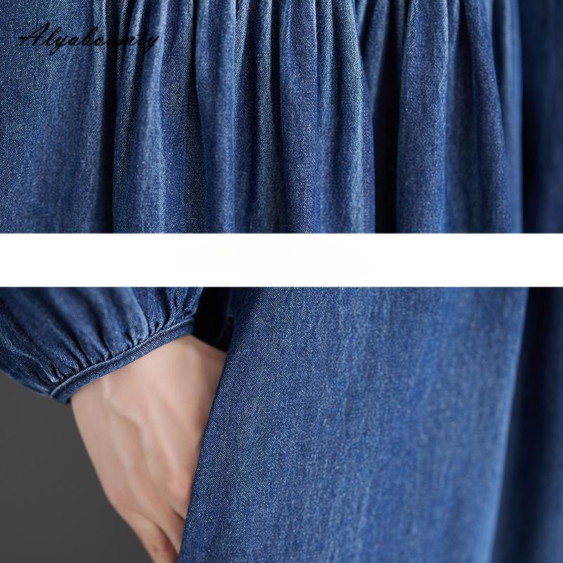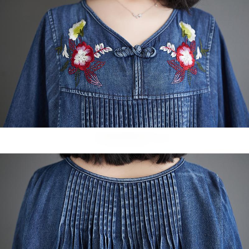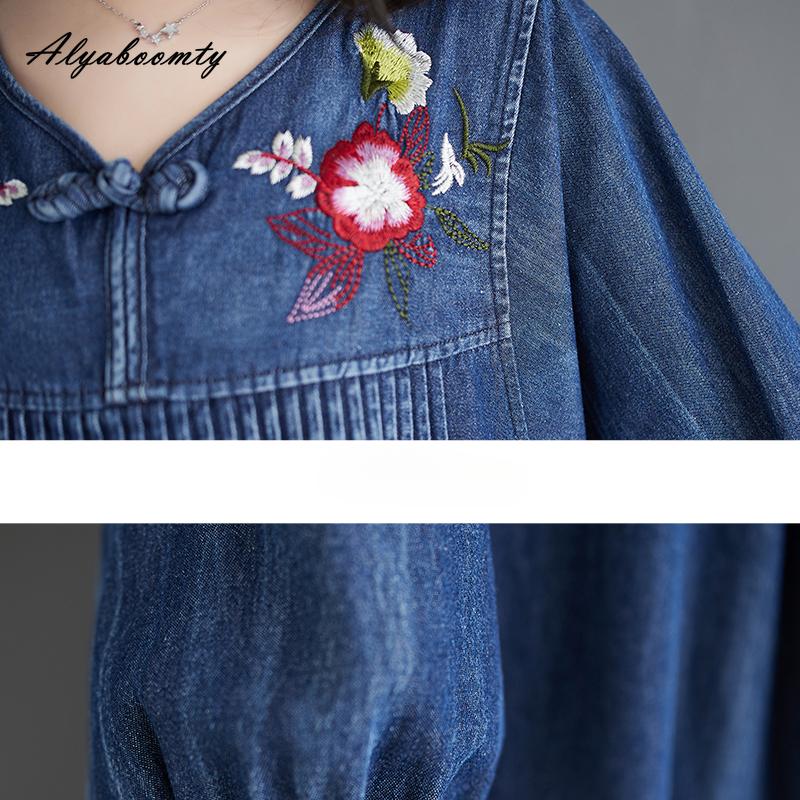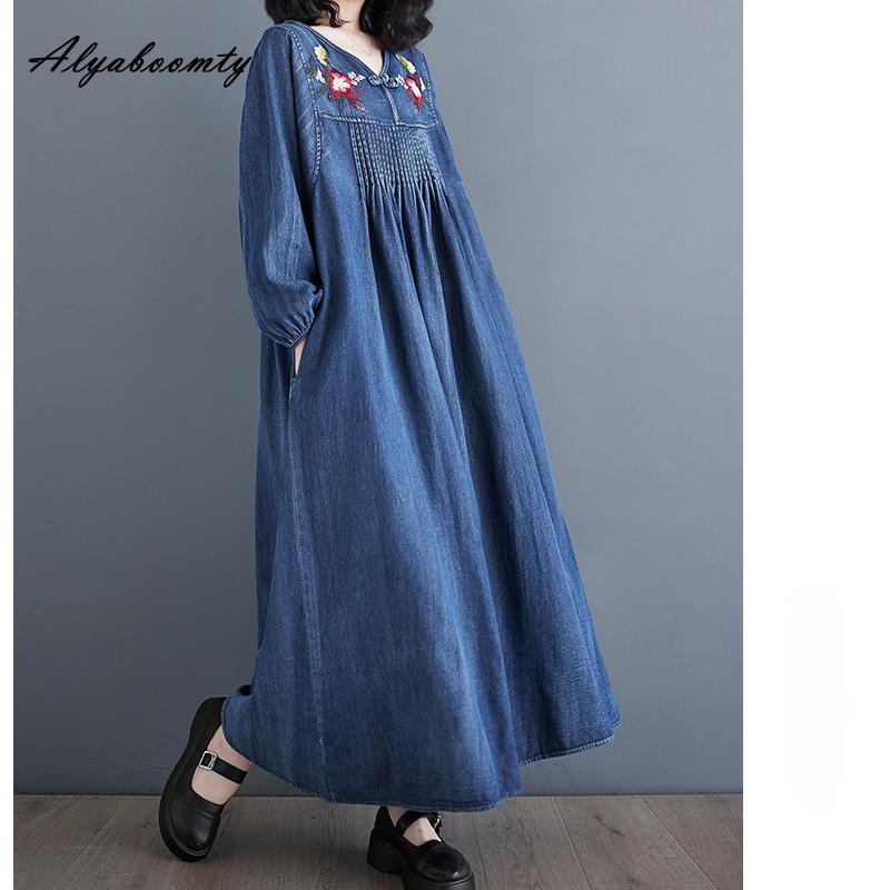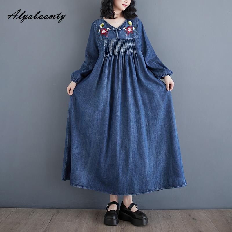 Плюс размер весна осень женское джинсовое платье миди с v-образным вырезом и цветочной вышивкой, свободное платье большого размера, с рукавами-фонариками, элегантное женское платье