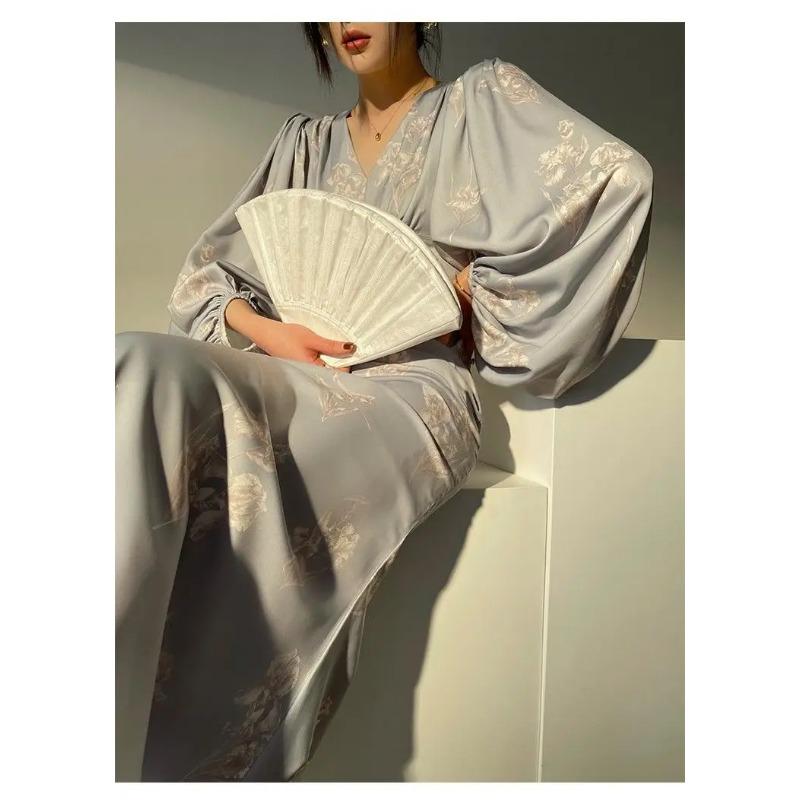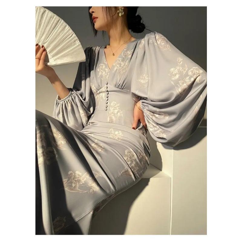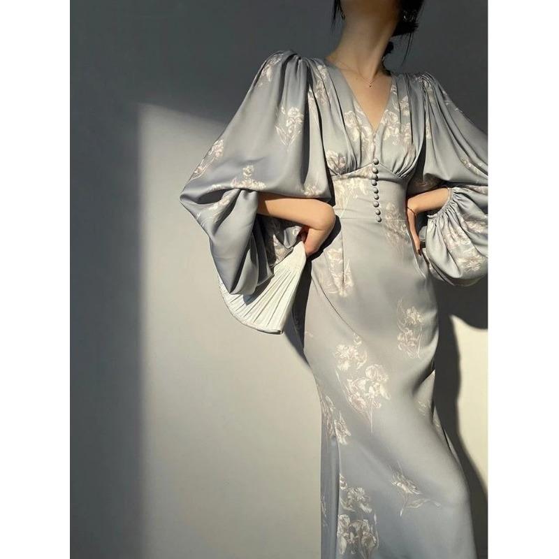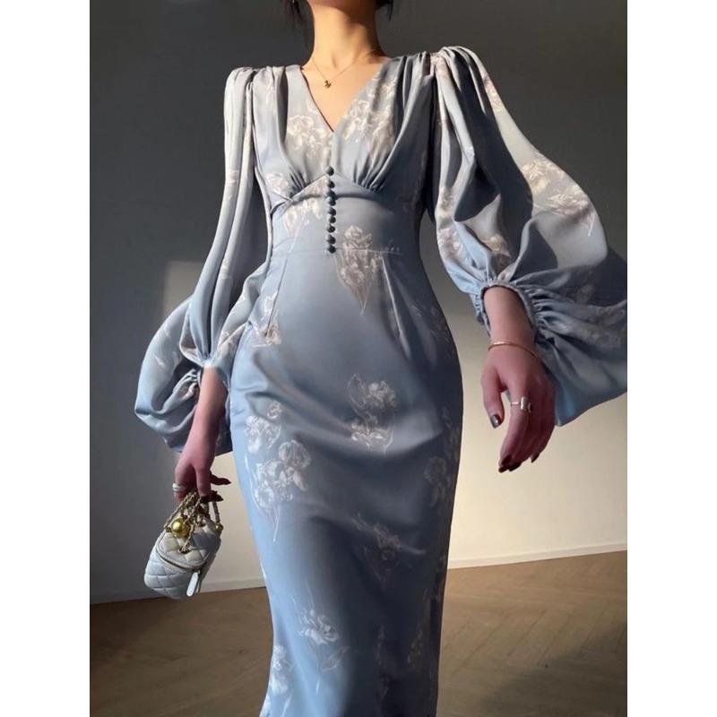 Новые элегантные платья русалки с принтом для женщин, новые летние тонкие платья с v-образным вырезом и длинными рукавами для подиума, вечерние платья, женские платья