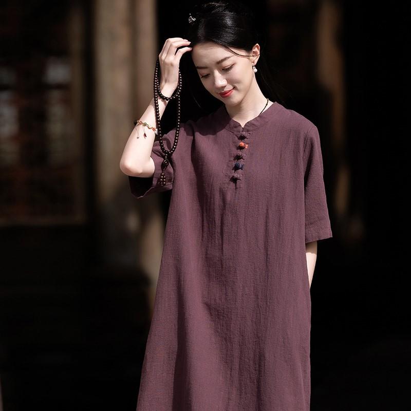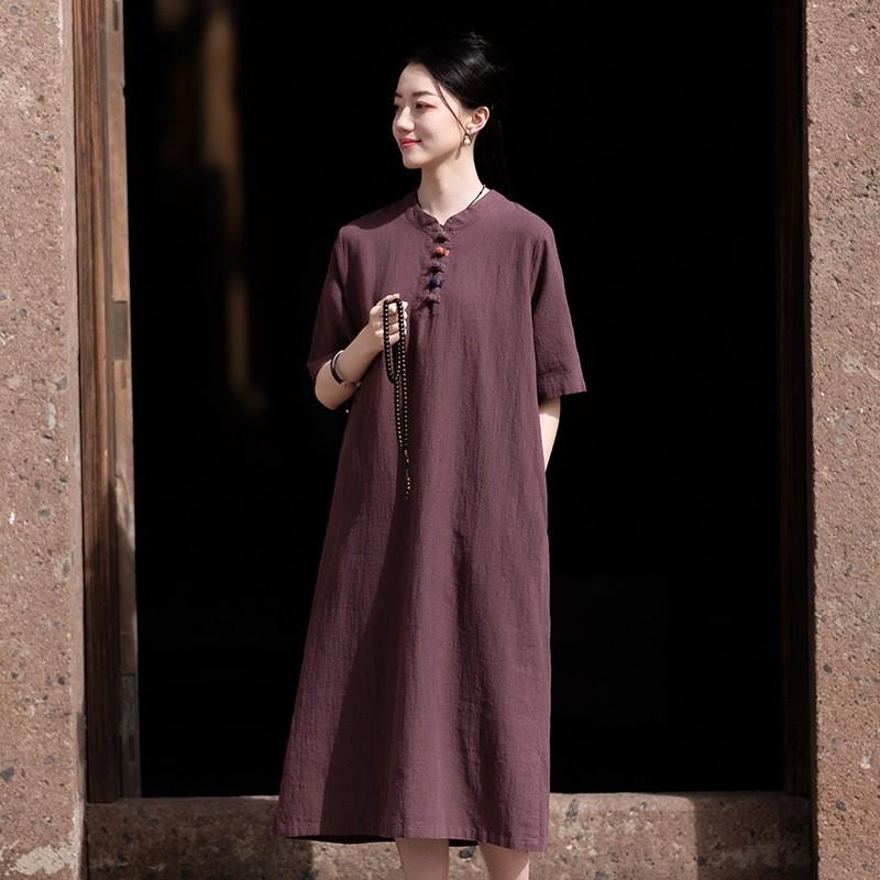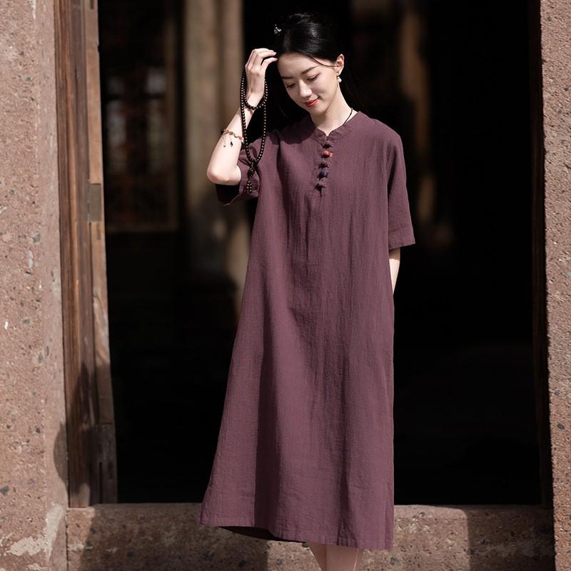 Johnature Женские платья-стойки в китайском стиле с коротким рукавом трапециевидной формы, летние винтажные фиолетовые женские платья