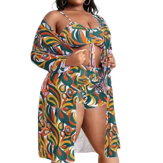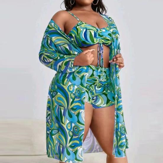 Комплект женского купальника, состоящий из трех частей, включает в себя шапочку для плавания и очки для создания завершенного пляжного образа.
