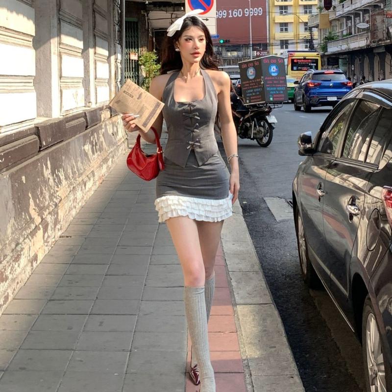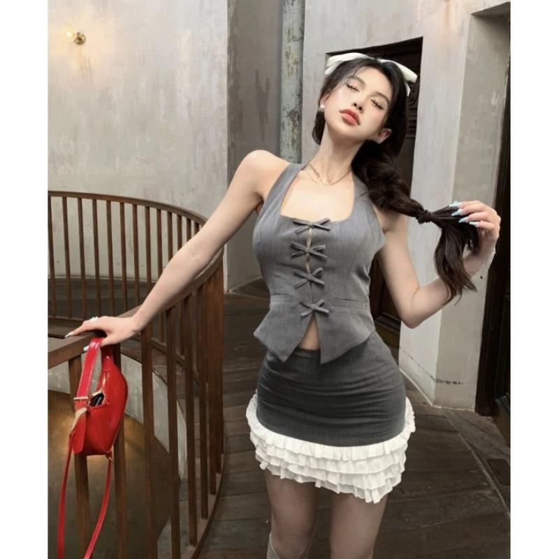 2000-е годы, винтажная одежда Y2k, комплект из двух предметов с короткой юбкой, женский повседневный укороченный топ + юбка с запахом, лето 2024, летние корейские модные костюмы