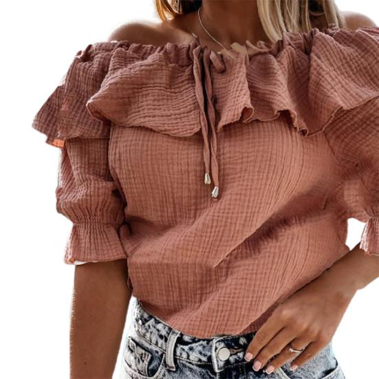Воротник с открытыми плечами, галстук и оборки с короткими рукавами, эти женские топы повседневны и отлично подходят для ношения летом и весной.
