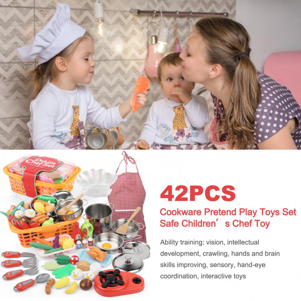 1. Детская кухня игровой набор для игр: Набор из 42 высококачественных игрушек включает в себя кастрюли, сковородки, фрезы, столовые приборы, фартуки, шляпы шеф-повара, плиты, а также овощные и фруктовые игрушки. Этот набор кулинарных принадлежностей содержит все, что нужно детям, чтобы получить свою жену для кухни и наслаждаться бесконечным кулинарным весельем.