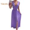Женское вечернее платье с V-образным вырезом без рукавов, плиссированное подол с разрезом, тонкая талия, длина до пола, сплошной цвет, свадебное коктейльное платье для выпускного вечера, макси-платье