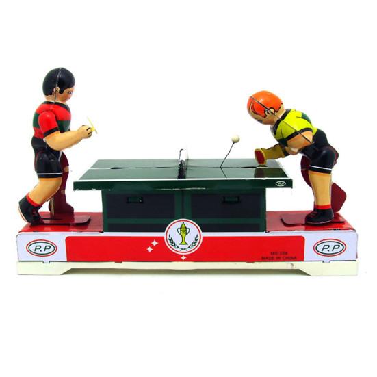 Примите участие в ретро-развлечении: Заведите часовой механизм и станьте свидетелем оживленного матча двух спортсменов по настольному теннису.; Наслаждайтесь непрерывным движением вперед-назад этой ностальгической игрушки из жести.