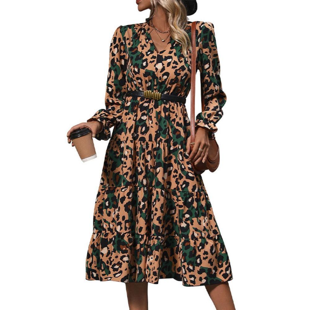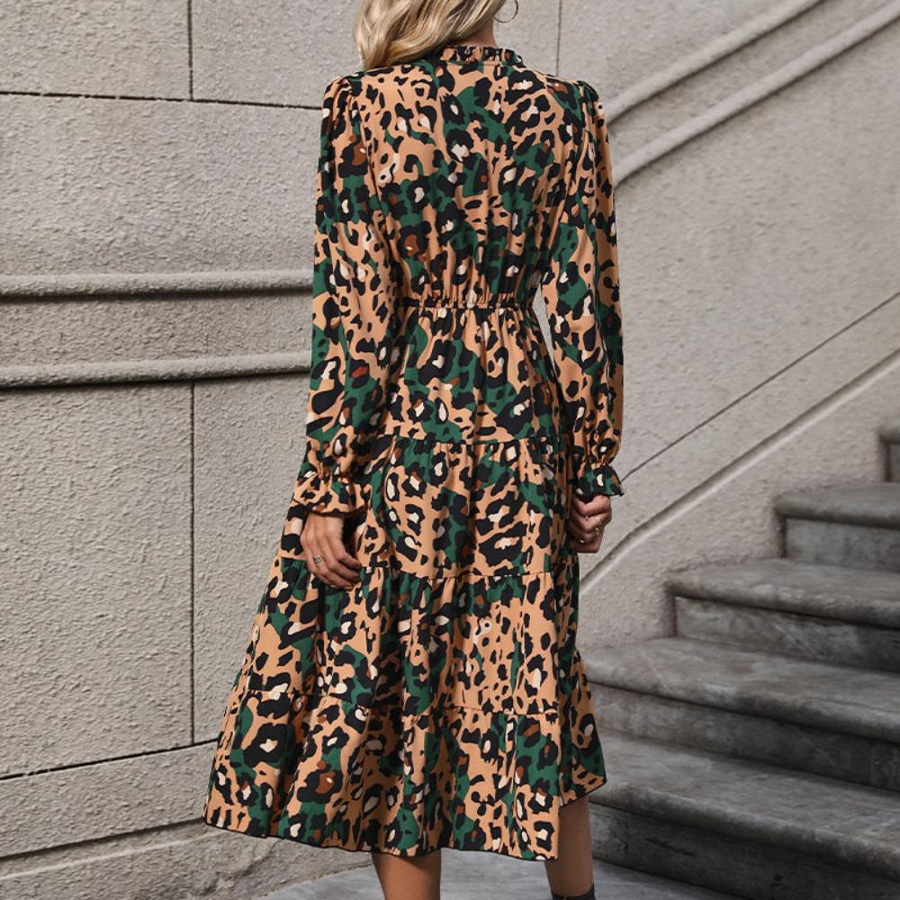 Осеннее женское платье средней длины с леопардовым принтом и длинными рукавами