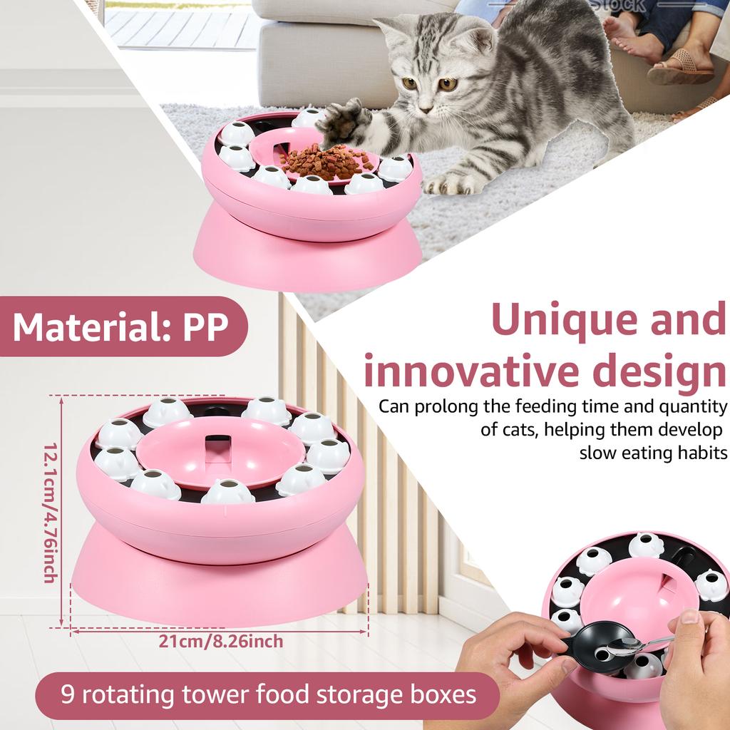 [Креативный дизайн] Эта миска для медленного питания для кошек имеет 9 вращающихся контейнеров для хранения еды в виде башни, только если постоянно вращать кормушку, ваш питомец будет вознагражден закусками.. Она может продлить время и объем еды для кошек, помогая кошкам выработать привычку к медленному питанию, а также является миской для кошачьего корма, которая может помочь кошкам, страдающим ожирением, похудеть.