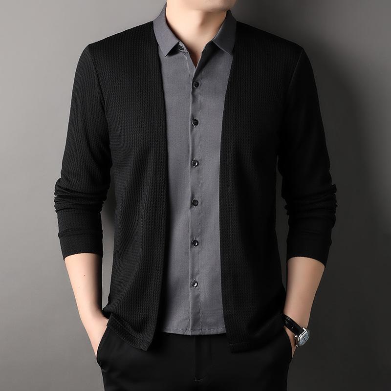 Осенний однотонный мужской вязаный кардиган в корейском стиле из двух частей, футболка с длинными рукавами, универсальная футболка, мужская одежда