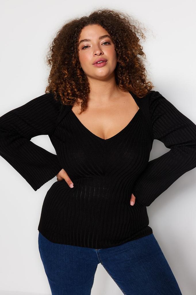 Женский стиль больших размеров, черный трикотаж в рубчик с широким воротником, свитер