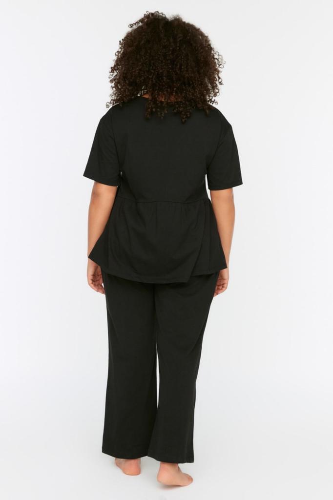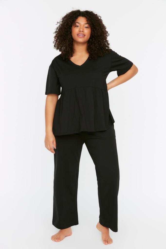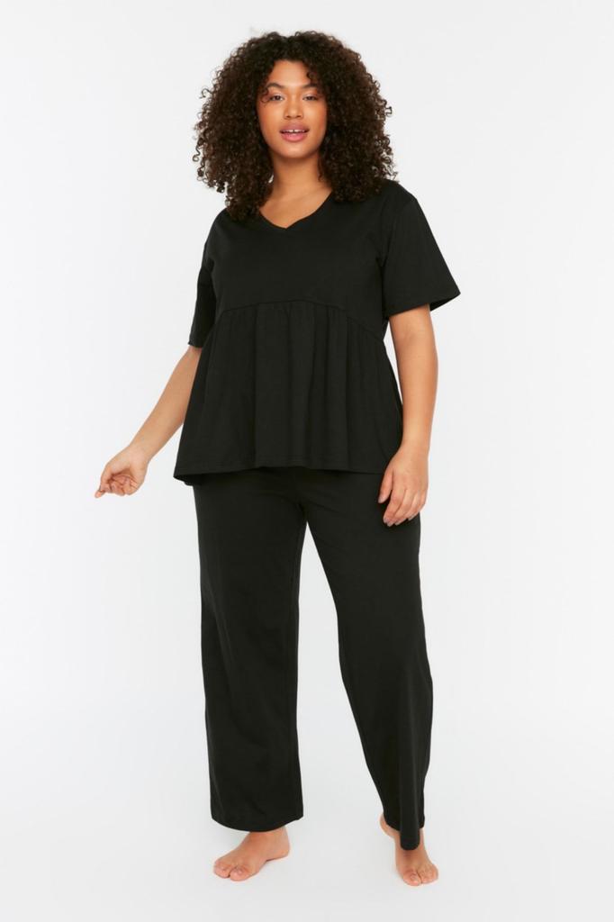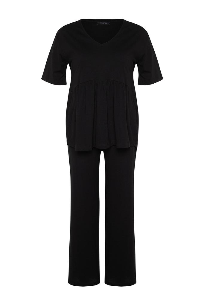 Женский стиль, черный вязаный пижамный комплект больших размеров с v-образным вырезом