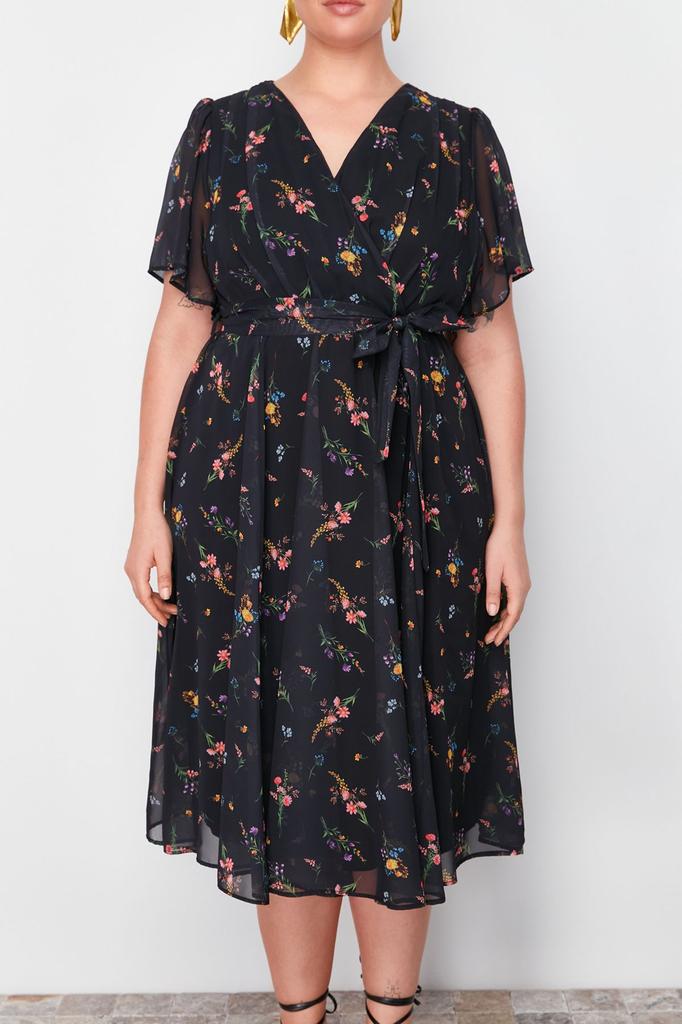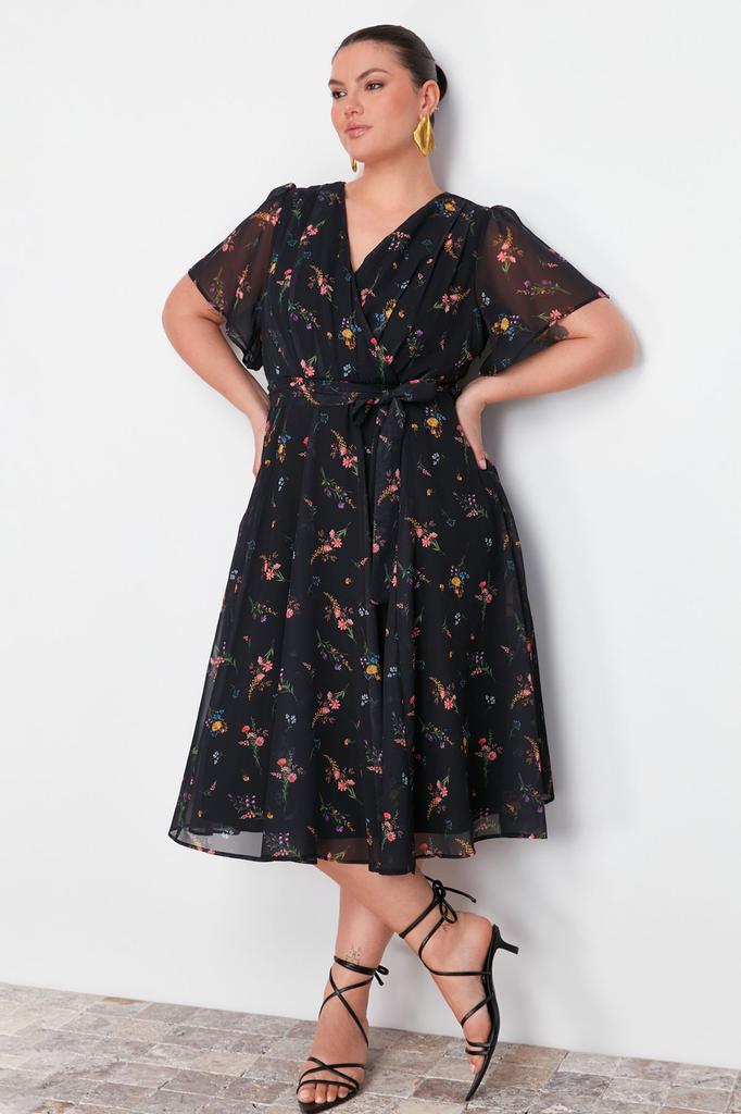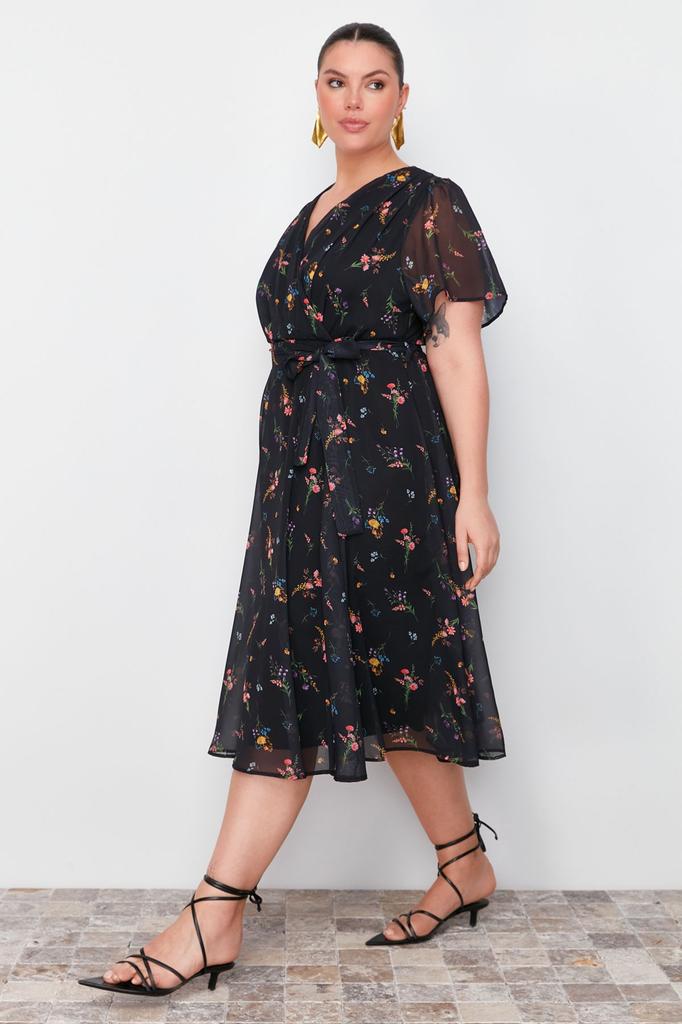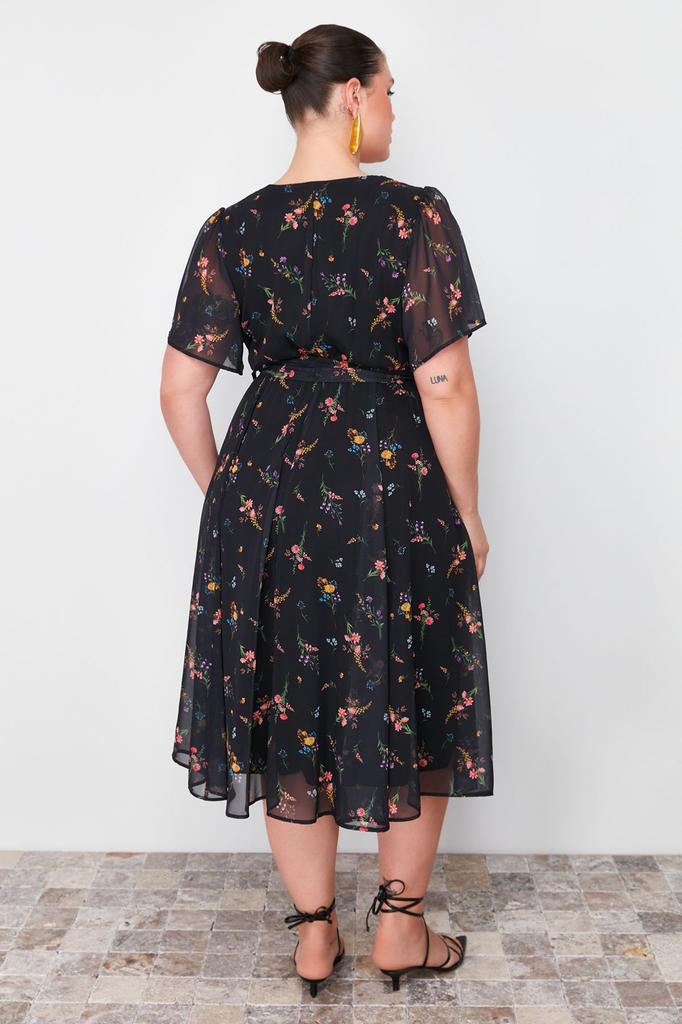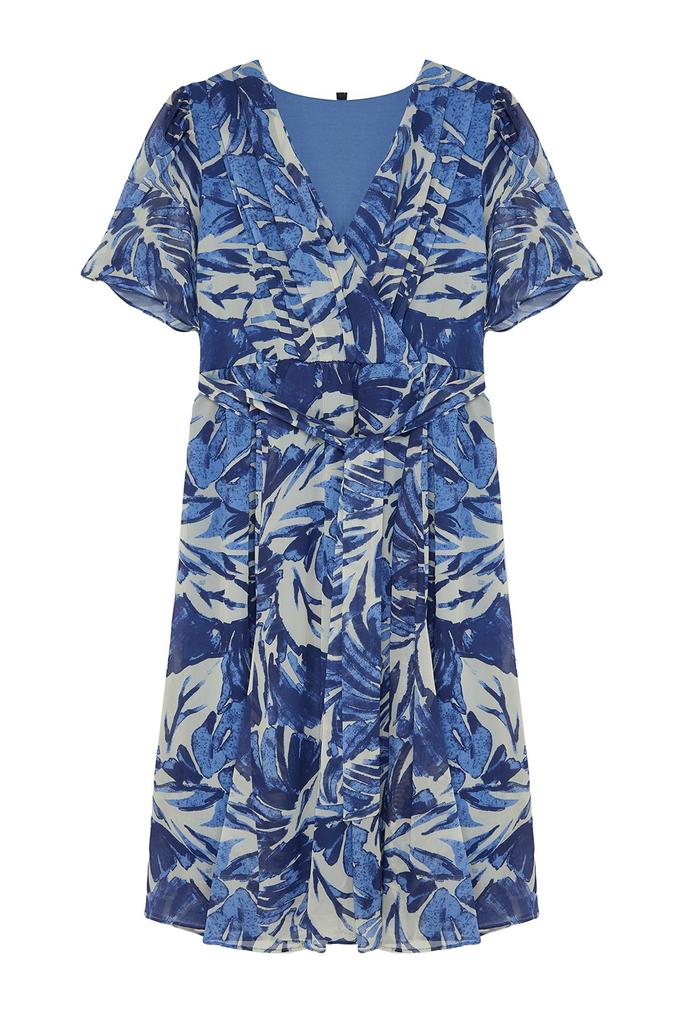 Женское стильное шифоновое двубортное тканое платье больших размеров синего цвета с тропическими листьями и узором