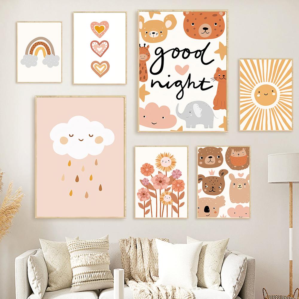 Милый мультфильм детская стена солнце радуга плакат печать животное детская комната картина печать ребенок маленький медведь цветок холст домашний декор