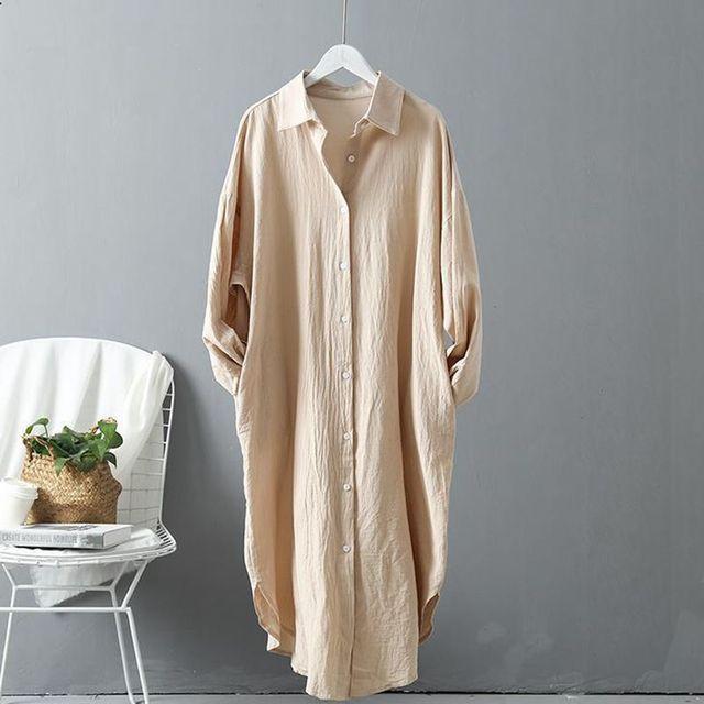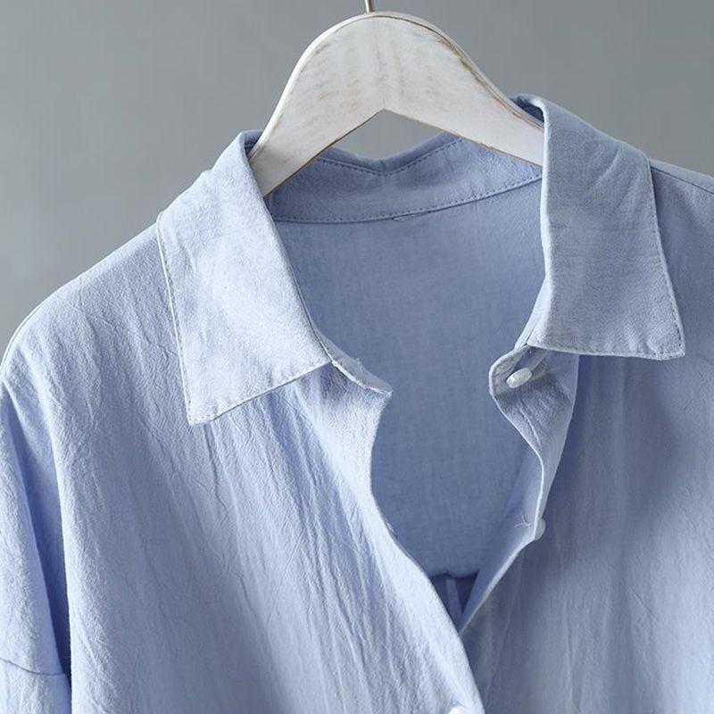 Однотонная повседневная хлопково-льняная рубашка с воротником-поло, X-длинная рубашка с длинным рукавом, женская блузка, рубашка, корейская модная женская одежда, топы, весна