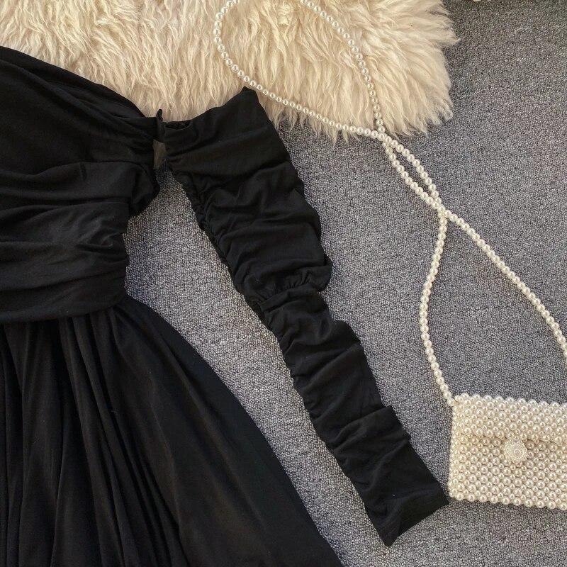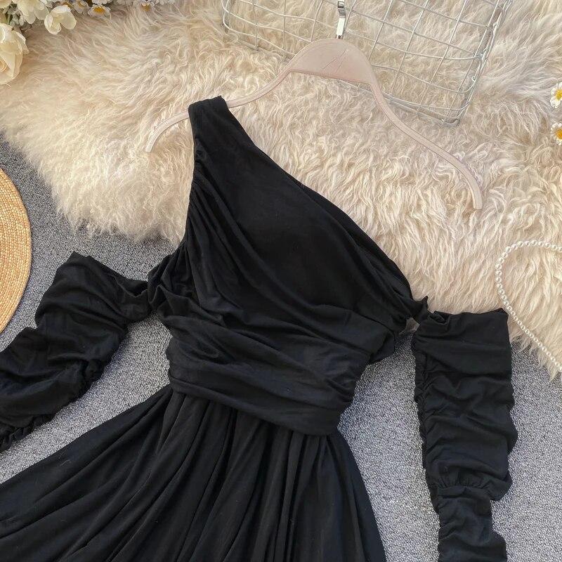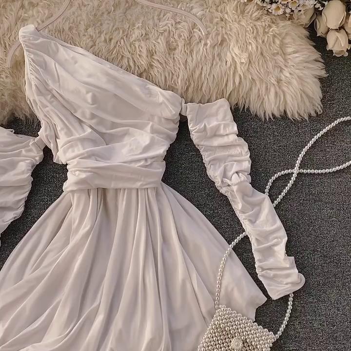 Шикарное элегантное плиссированное платье с длинным рукавом, женское пляжное праздничное платье с диагональным воротником, женское корейское модное мини-платье трапециевидной формы 2024