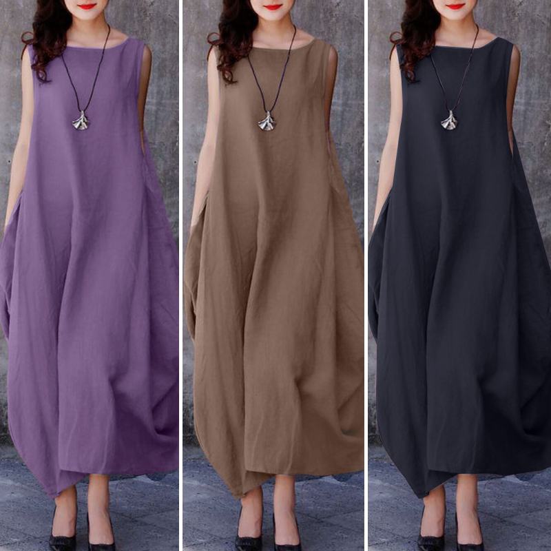 Женское повседневное хлопковое платье, летнее свободное длинное платье без рукавов с круглым вырезом