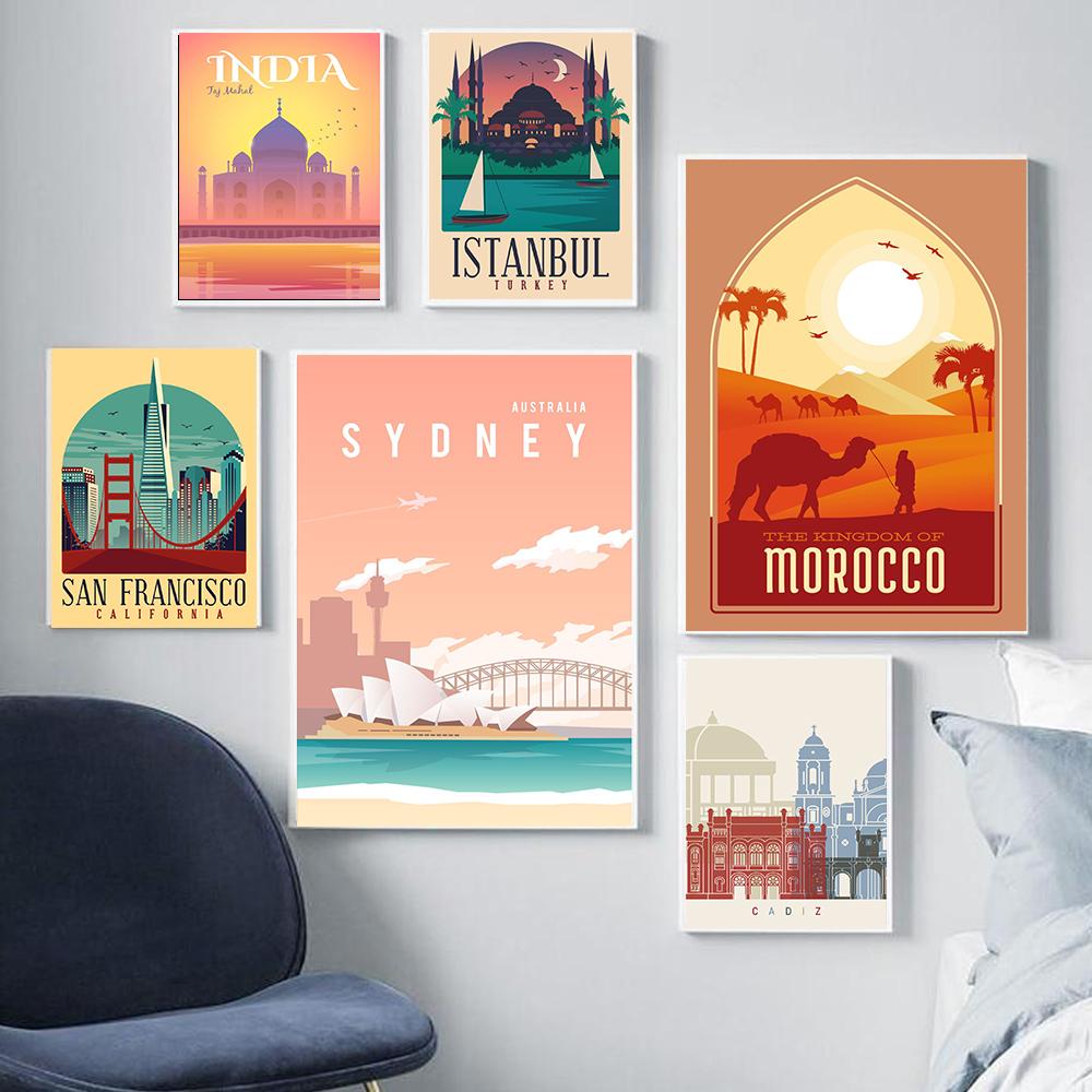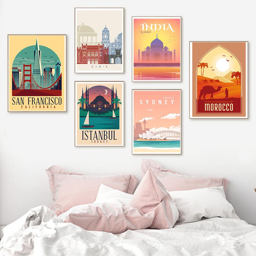 Nordic Vintage Travel City Poster San Francisco Rome Sydney India Morocco Landscape Art Картина на холсте Настенные картины Декор