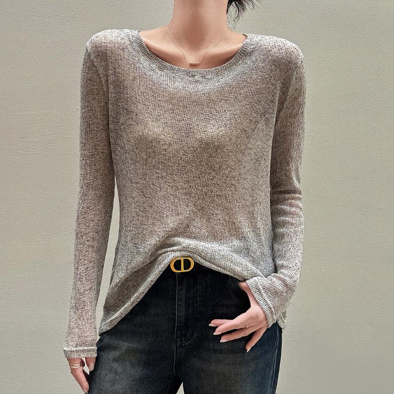 Летние тонкие футболки с длинными рукавами для женщин, свободная трикотажная футболка с круглым вырезом, однотонные повседневные футболки