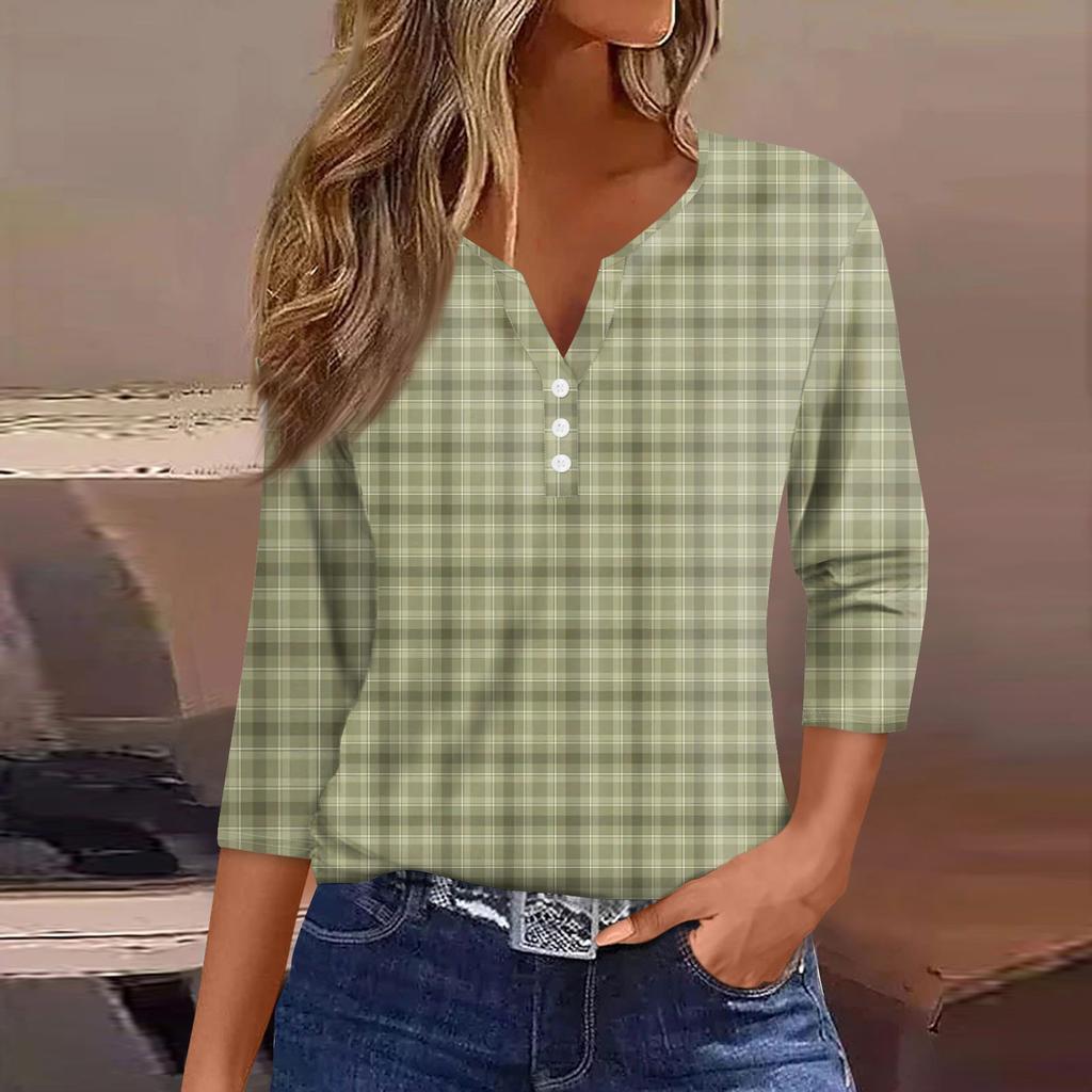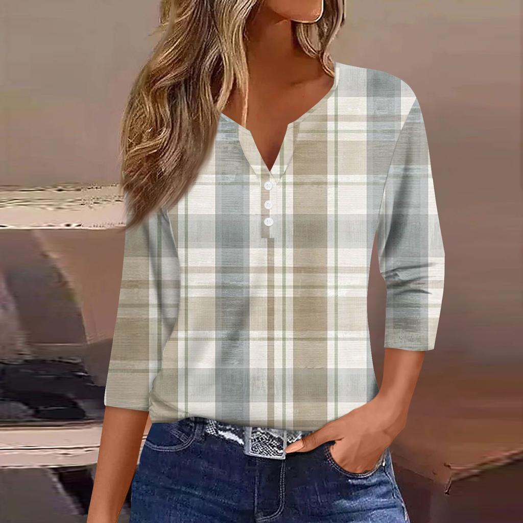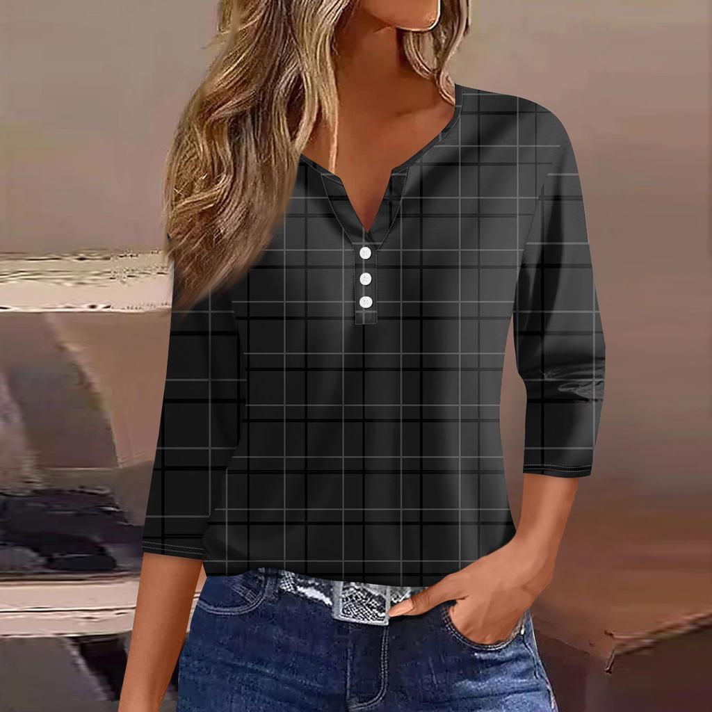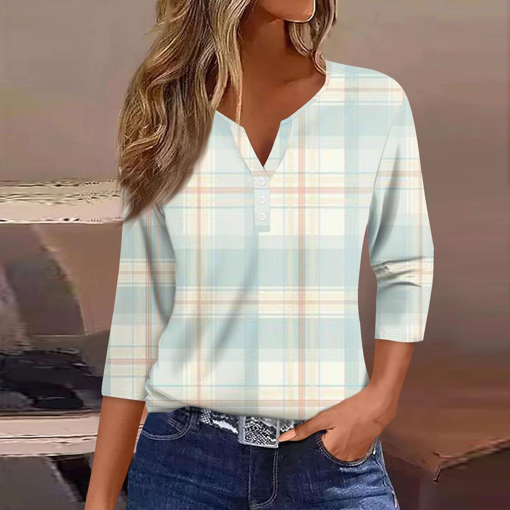 Женская модная повседневная футболка с v-образным вырезом и семью рукавами, топ на пуговицах с градиентным принтом