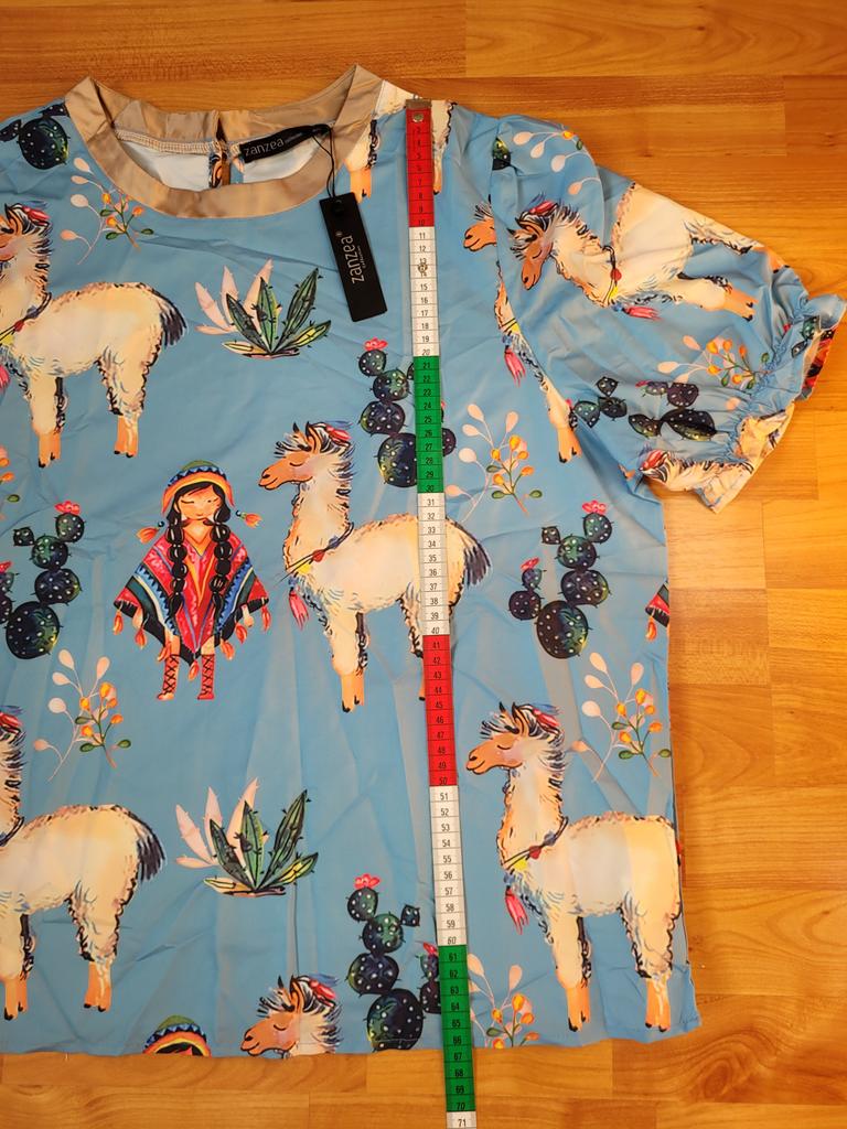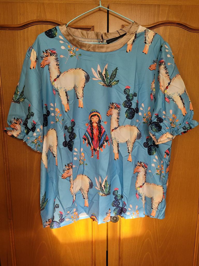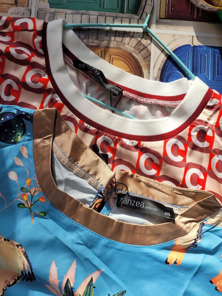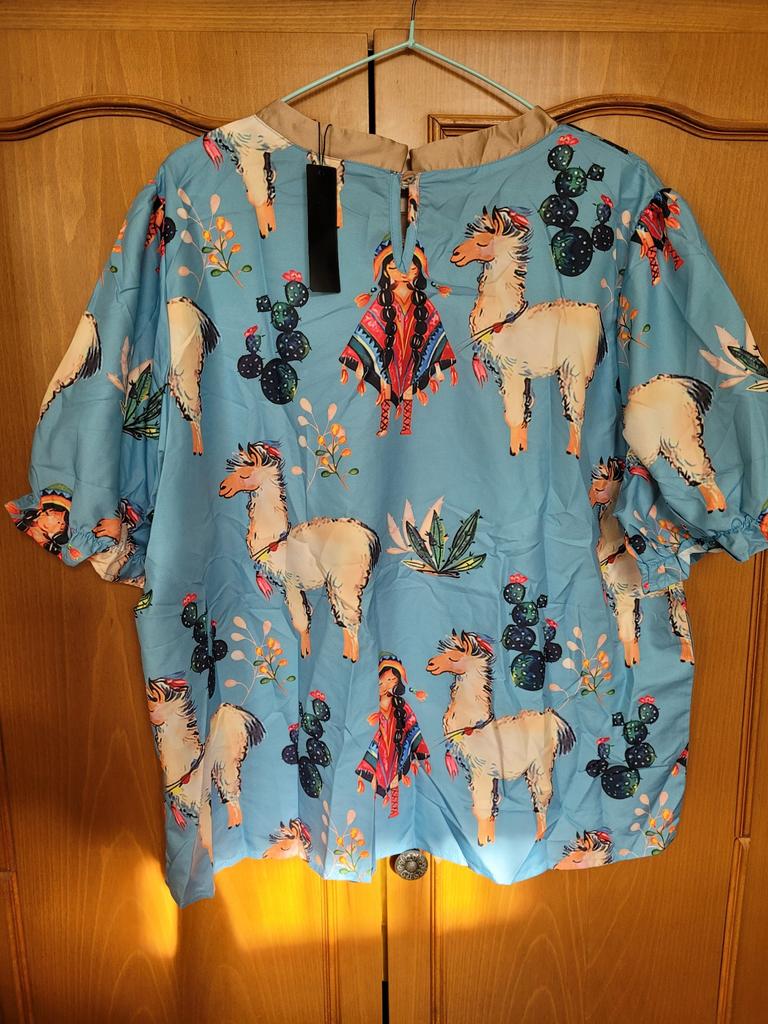 Блуза от ZANZEA. Заказ 14.07 - 13.08. Покупала за 685 руб. Размер 4XL. Цвет заказа *синий*. 🔹️Фасон не соответствует промофото. Выбирала блузу по фасону футбоки, пришла с застежкой на спине... на промофото этого НЕТ. 🔹️Ранее покупала такие, горловина и прочее были отделаны трикотожной резинкой, мне пришла с горловиной отделанной тканью типа атласа и с пуговицей не спине, я такие фасоны терпеть не могу, никогда бы не выбрала, промофото врет. 🔹️В остальном... размер соответствует, мерки см. в слайдшоу, но очень не понравилась ткань! Синтетика, как для зонтиков или слегка под плотный синтетич. атлас, аж шелестит, наверное не дышит, не тянется, сидит странно для *летней* вещи, колом, не драпируется в мягкие складки... носить такое не буду. У нас жара летом под 40°С и выше, поэтому в таких тканях не ходят. ❗️❗️...И девочки, не верьте отзывам без каких-то фото, что ткань типа шифон, это ВРАНЬЁ, никакой это не шифон, а жуткая синтетика, аж скрипит. Я вам сняла короткое видео для наглядности. 🔹️Больше экспериментировать не хочу, то размер присылают от фонаря, то ткань дешманская, то фасон врет, на промофото одно, а присылают другое. Вот расцветка мне идет, но носить не хочу. ...Не разделяю я восторгов от этого раскрученного бренда. Может в балахонах - простынях косяки не так заметны, но в других фасонах просто слезы. Да и ткани уж очень дешманские, большинство смотрятся стремно и не носибельно.