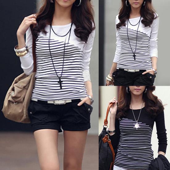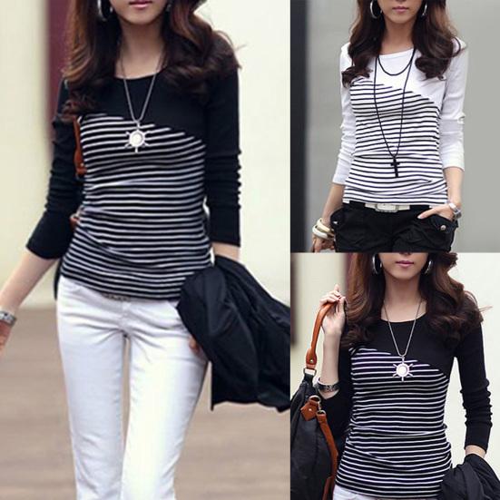 Модная весенняя женская футболка в полоску с длинным рукавом и круглым вырезом, облегающий топ