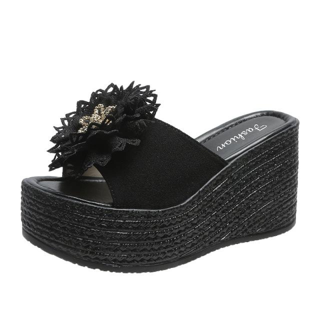 Летние босоножки и тапочки на танкетке с толстой подошвой и открытым носком. Женские модные женские тапочки с цветочным узором. Женская обувь.
