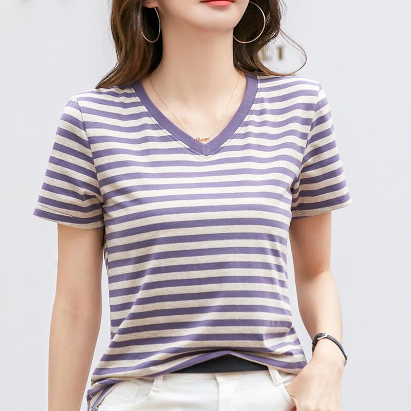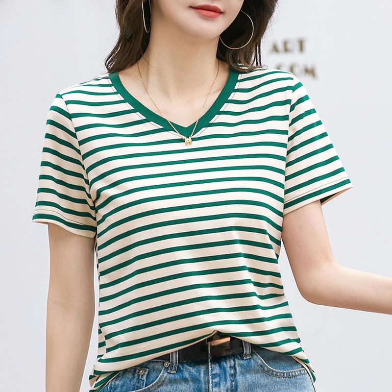 Летняя женская футболка с v-образным вырезом, полосатый топ с короткими рукавами
