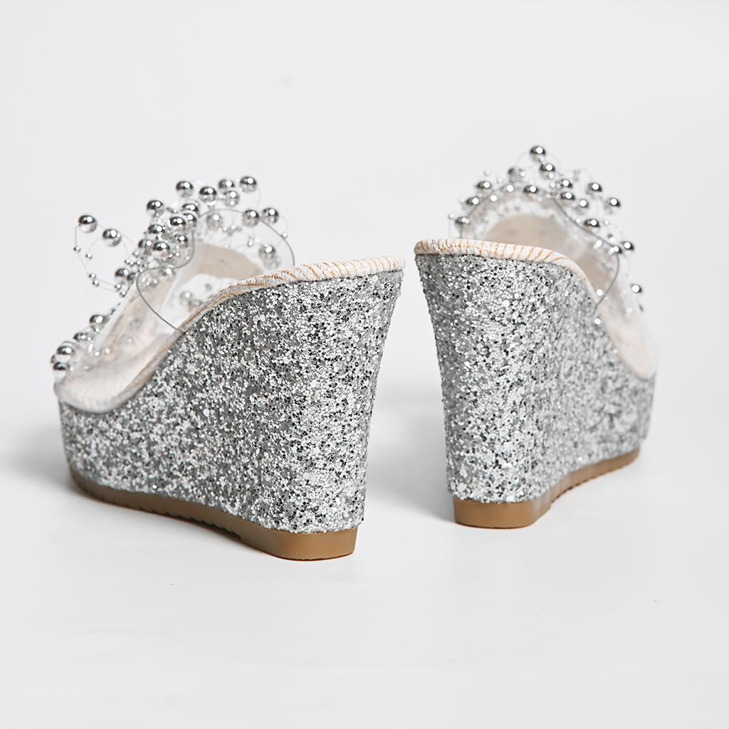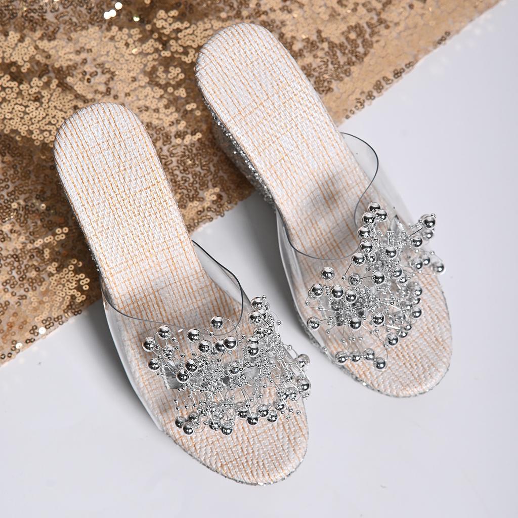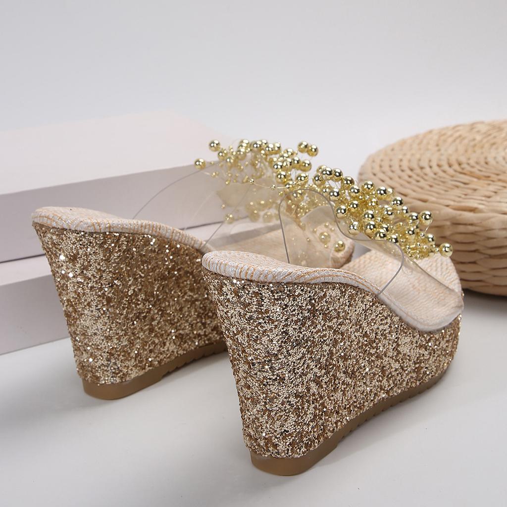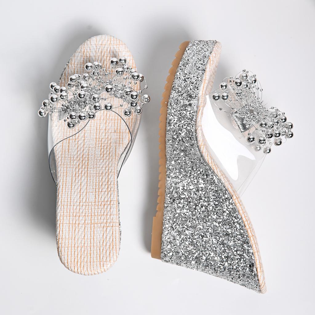 Женские сандалии на наклонном каблуке с толстой подошвой, трехмерные металлические цветы на высоком каблуке, модные для отдыха золотые, серебряные сандалии, летние тапочки