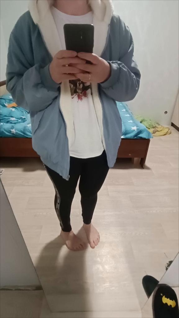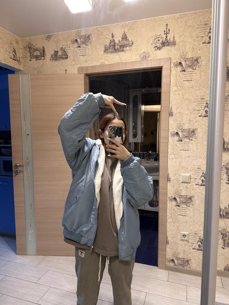 Куртка идеальная! Конечно же отличается от фото в объеме, но это было ожидаемо, на теплую весну будет в самый раз, мягкая и приятная 🥰 +стоит понимать, что по цвету она будет действительно нежного небесно-голубого оттенка, по фото казалось, что она больше серая, но это не делает её хуже) П.с. На рост 157см и вес 45кг XL скорее как раз, а не оверсайз