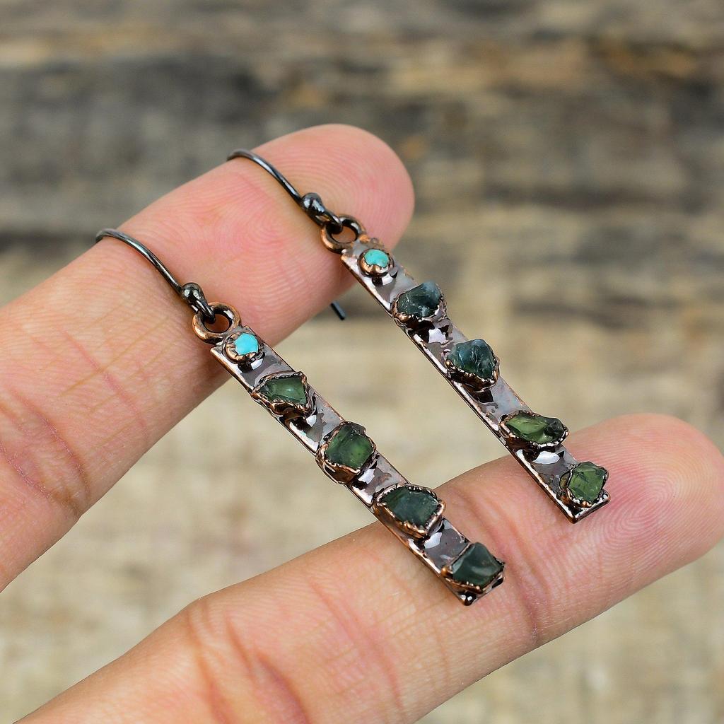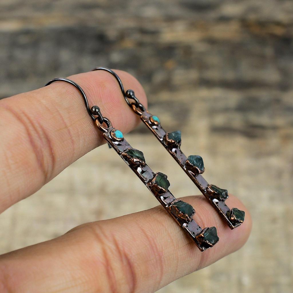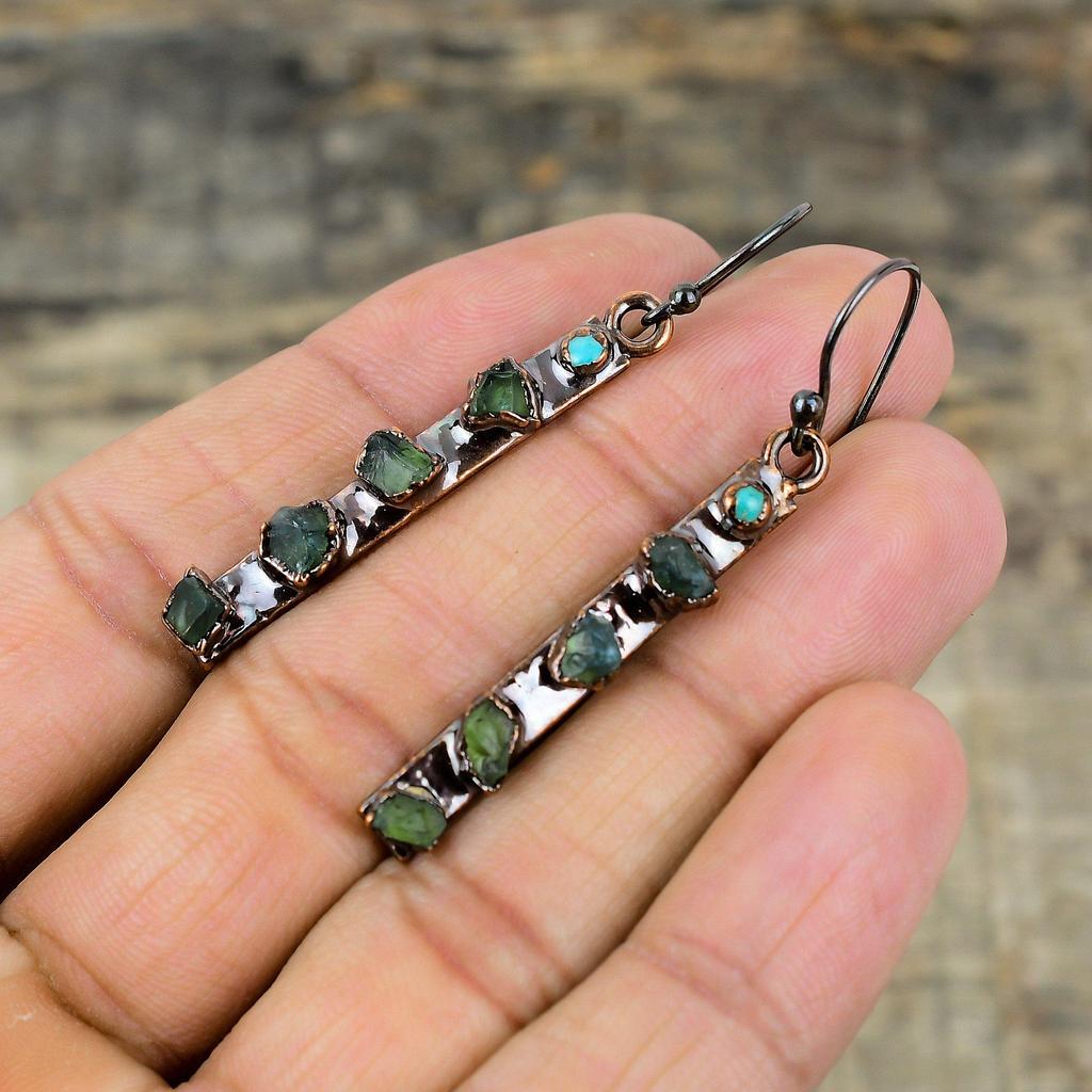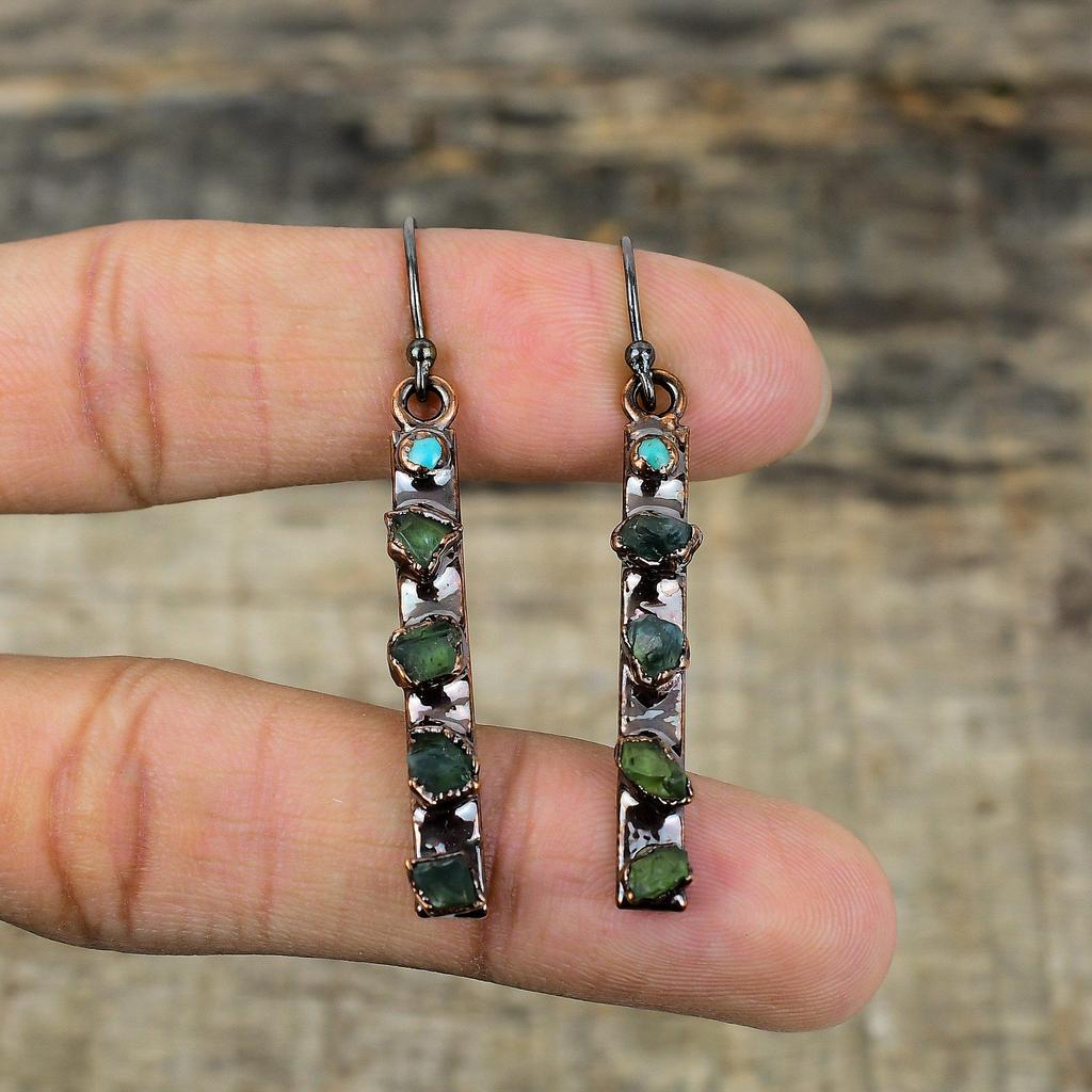 Грубые серьги с зеленым турмалином, медные серьги, полученные гальваническим способом, серьги с драгоценными камнями Аризоны и бирюзы, ювелирные изделия ручной работы, гальванические украшения, подарок для жены