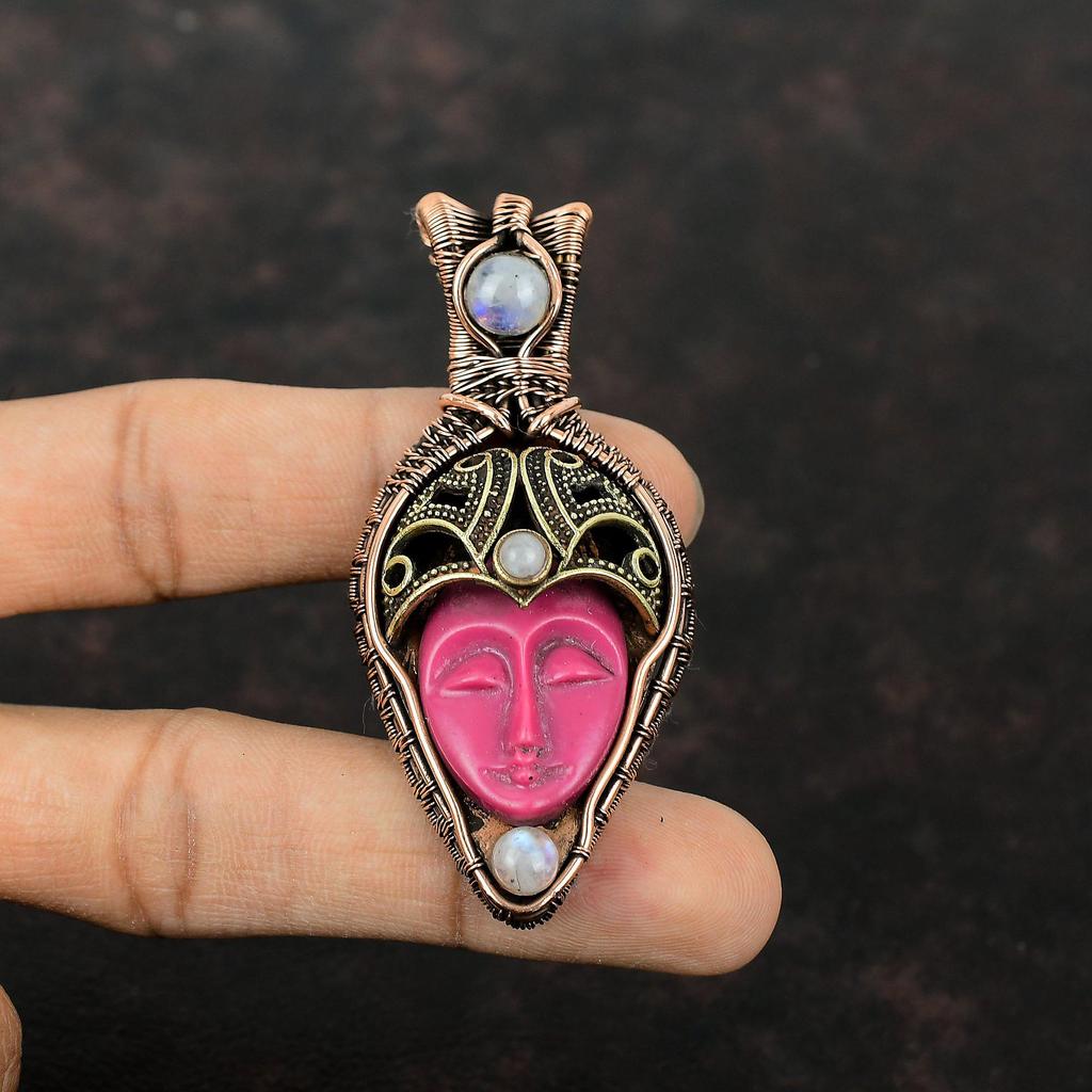 Розовый резной кулон из кости для лица, медная проволока, обернутый кулон, Радужный кулон с лунным камнем, ювелирные изделия из драгоценных камней, подарок на помолвку, медные украшения ручной работы