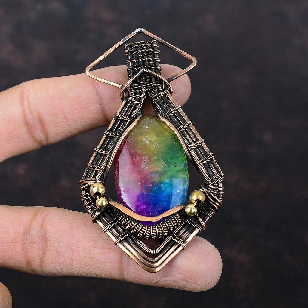 Радужный солнечный кварцевый кулон с друзами, кулон из медной проволоки, стильный кулон ручной работы, медная проволока, ювелирные изделия, кулон с драгоценным камнем для подарка