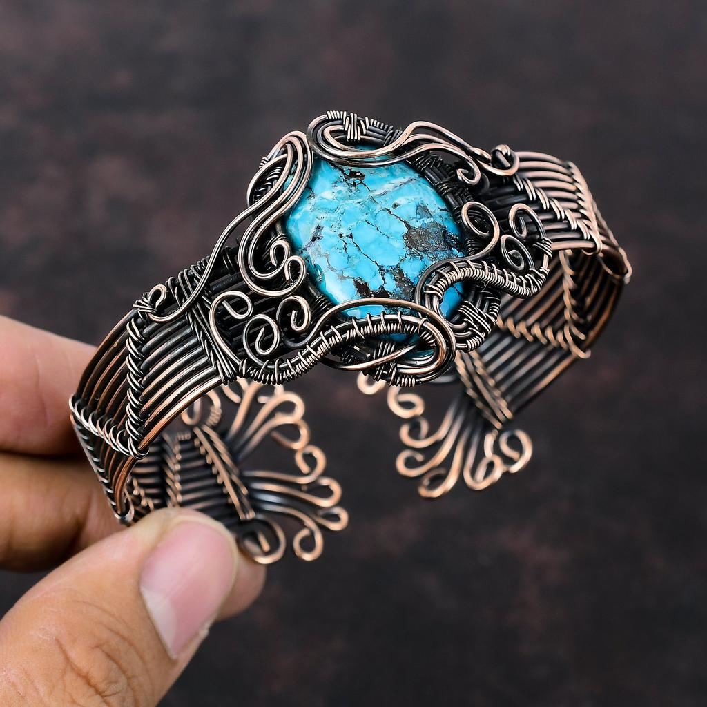 Браслет из тибетского бирюзового камня, регулируемый браслет-манжета, браслет из медной проволоки, дизайнерский браслет ручной работы, медные ювелирные изделия в подарок для женщин