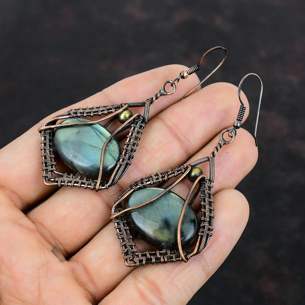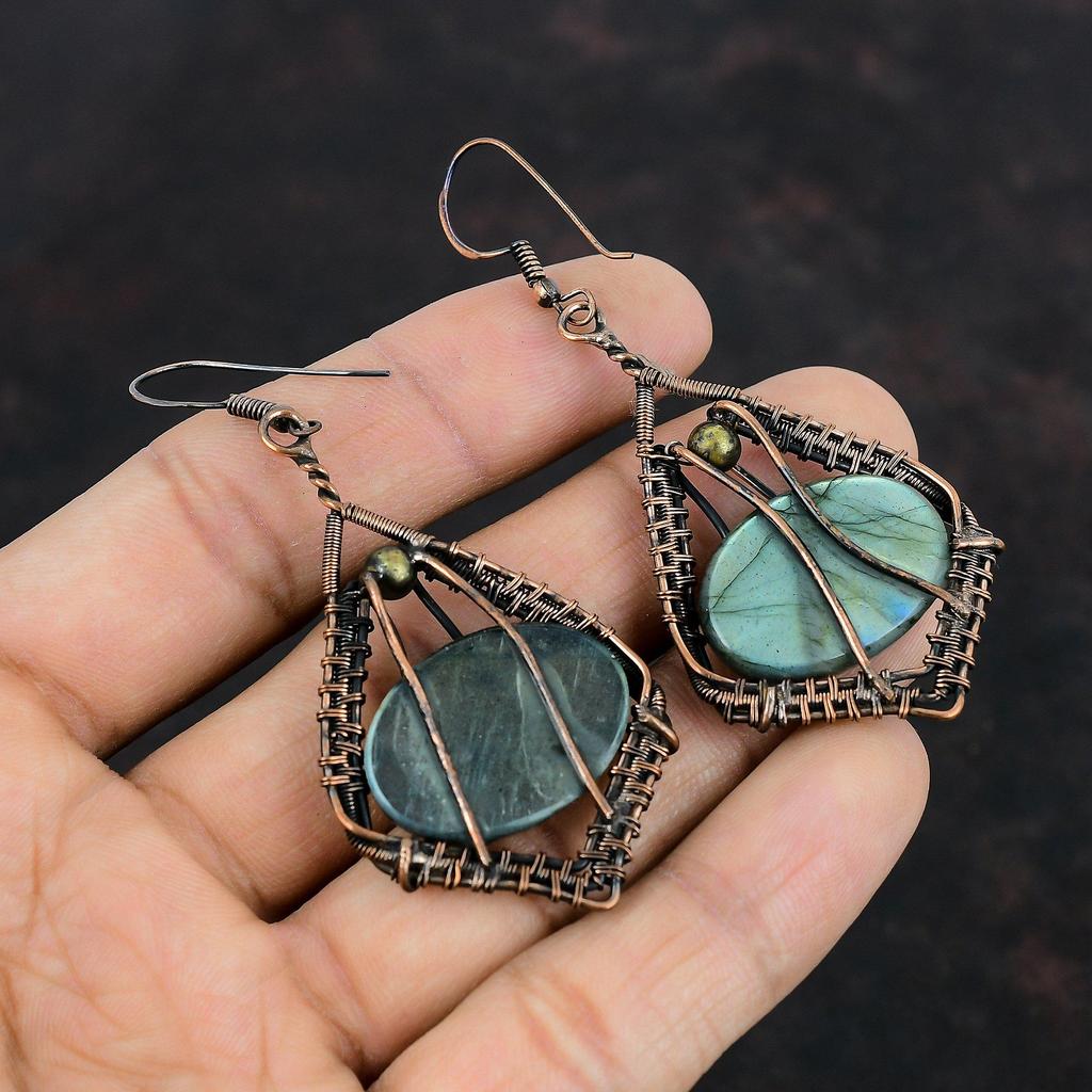 Медные серьги с лабрадоритом, ювелирные изделия из медной проволоки, серьги из натурального драгоценного камня, серьги ручной работы, обернутые проволокой, изысканные ювелирные изделия, подарки для нее