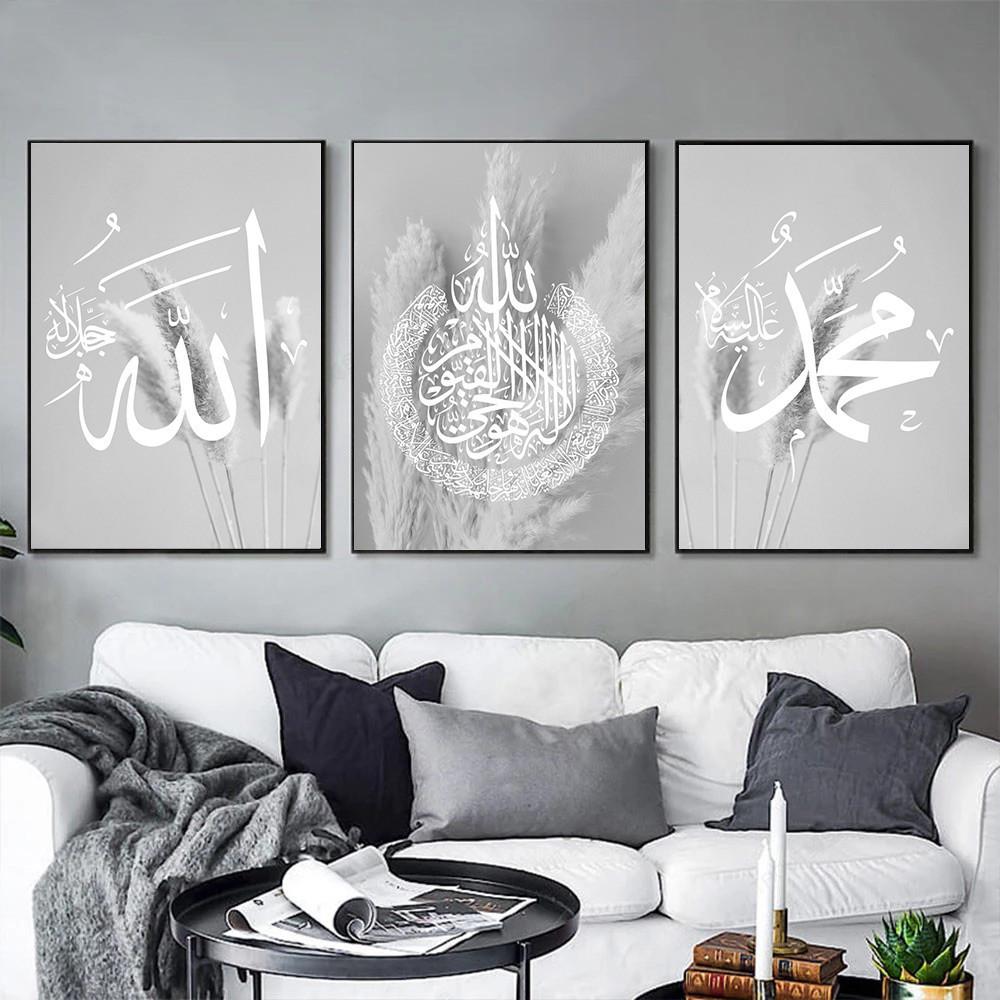 Аллах Аятуль Курси Коран Исламская каллиграфия Холст Картина Серая пампасная трава Плакат Печать настенные художественные картины Декор для гостиной