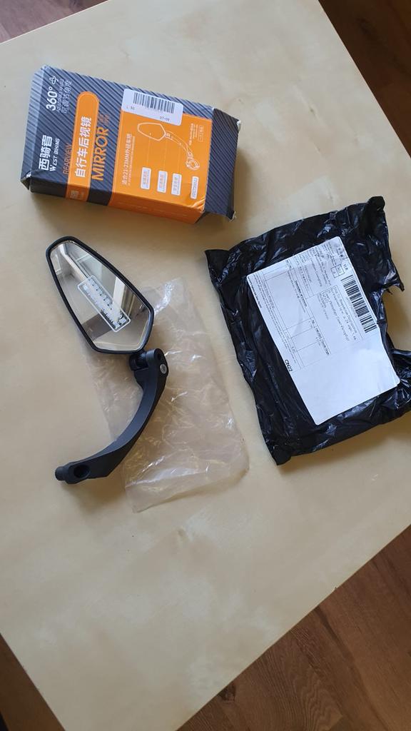 Зеркало в мятой и рваной коробке, не хватает хомута крепления с болтом на руль.