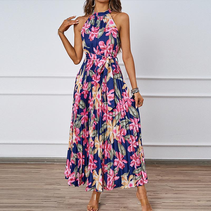 Женское шифоновое длинное платье с цветочным принтом во французском стиле, эластичные платья трапециевидной формы с короткими рукавами, летнее пляжное платье с богемным принтом