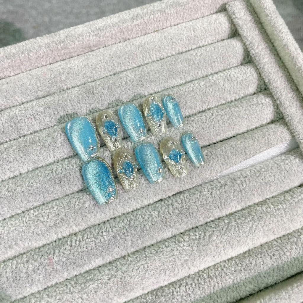 100% РУЧНАЯ РАБОТА Набор накладных ногтей средней формы в форме гроба с клеем Синий Buccellati Короткий кошачий глаз Spar Нажмите на ногти Накладные ногти Многоразовые и съемные ногти