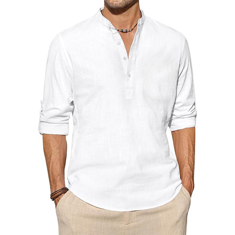 Хлопковые льняные рубашки для мужчин, повседневные рубашки, легкая футболка с длинными рукавами, однотонные топы с длинными рукавами, свернутые в рулон