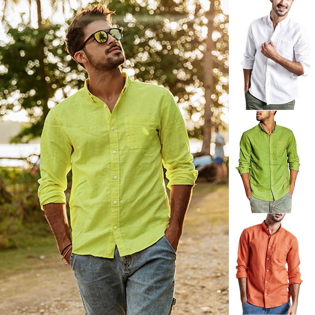 Модная мужская летняя повседневная блузка с длинными рукавами из льна и хлопка на пуговицах — купить товар онлайн с бесплатной доставкой до всему миру!