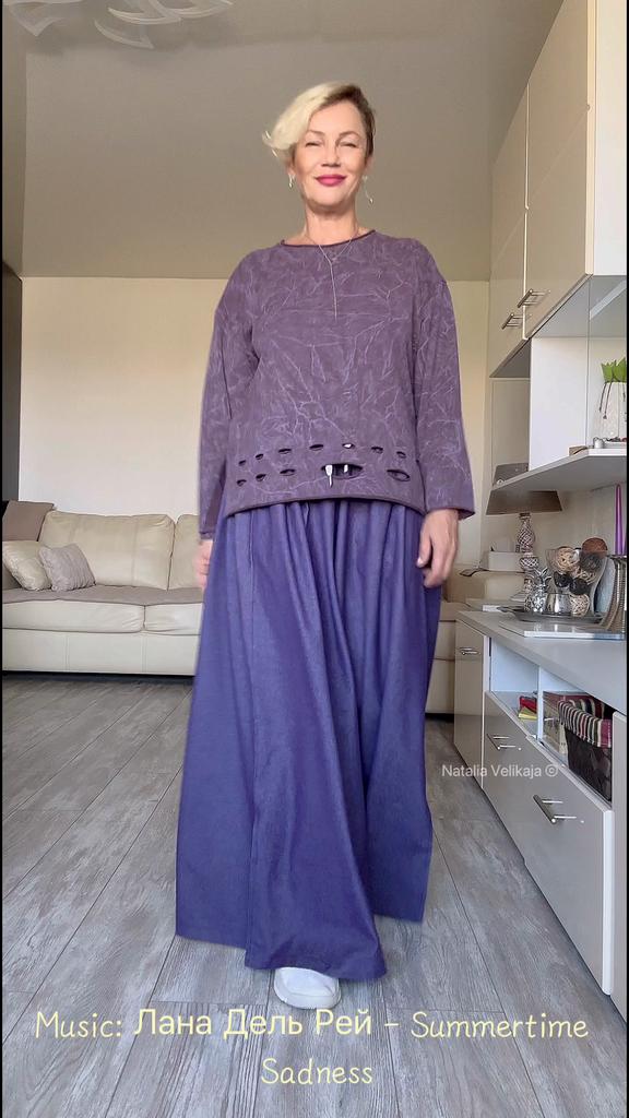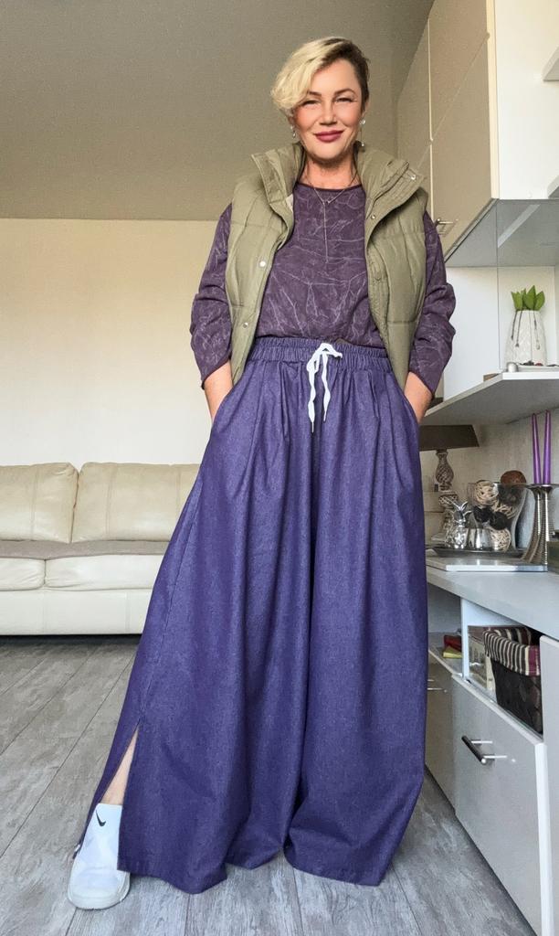 Фиолетовые широкие джинсы 📌На выбор три цвета. На мне размер 3 XL. Мои параметры : 167, 96-82-98. Я бы запросто могла взять размер меньше, потому что резинка на талии не тугая, и отлично тянется. Однако, благодаря тому, что джинсовая ткань мягкая, и прекрасно драпируется, и в этом размере джинсы смотрятся хорошо. 📌Посадка высокая. Широкая резинка и шнурок Боковые карманы глубокие Сзади клапан, без кармана Внизу разрезы. 📌Ткань не тянется, не электризуется, не просвечивает, смесовый хлопок. Пошив фабричный. 📐Замеры: ОТ 78-108 ОБ 198 Высота посадки 39 Длина внутреннего шва 70 Длина 103 Ширина брючины внизу 59 Ширина брючины в районе бедра 56