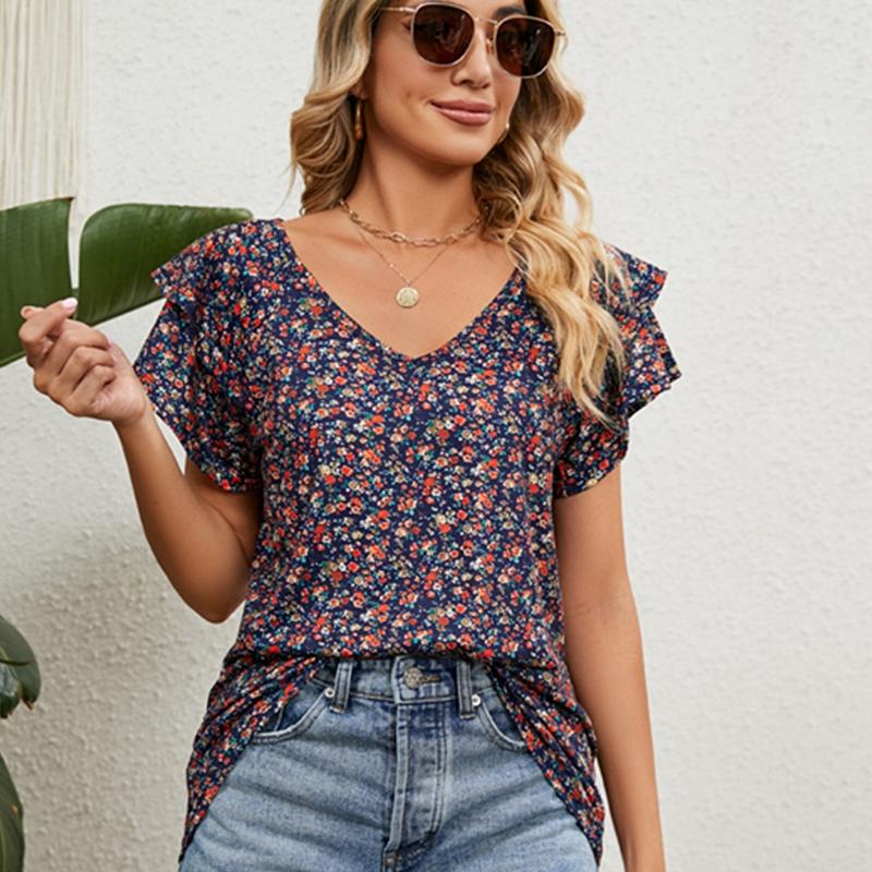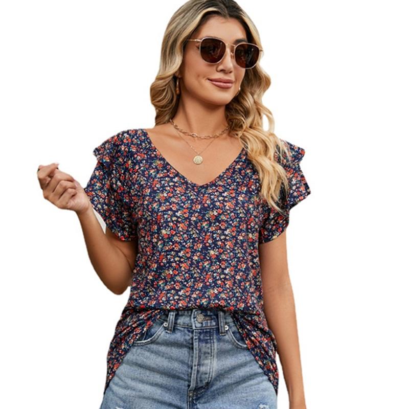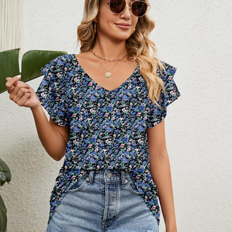 Женская летняя свободная футболка с v-образным вырезом с принтом и двойными рюшами на рукавах