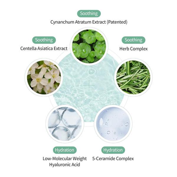 water, centella asiatica extract (5%), caprylic/capric triglyceride, glycerin, methylpropanediol, cetyl ethylhexanoate, behenyl alcohol, mugwort (artemisia princeps) extract, cetearyl olivate, sorbitan olivate, butylene glycol, allantoin, panthenol, vitis vinifera (grape) extract, ginkgo biloba leaf extract, polygonum cuspidatum root extract, scutellaria baicalensis root extract, camellia sinensis (green tea) leaf extract, chamomilla recutita (matricaria) flower extract, coffea arabica (coffee) seed extract, betaine, trehalose, fagus sylvatica seed extract, camellia japonica flower extract, adansonia digitata seed oil, hydrogenated lecithin, ceramide np, oryza sativa (rice) extract, lavandula angustifolia (lavender) extract, origanum vulgare flower/leaf/stem extract, rosmarinus officinalis (rosemary) extract, thymus vulgaris (thyme) extract, tocopherol, ceramide as, ceramide ns, ceramide ap, ceramide eop, hydroxyacetophenone, carbomer, alanine, 1,2-hexanediol, caprylyl glycol, xanthan gum, ethylhexylglycerin, sodium phytate